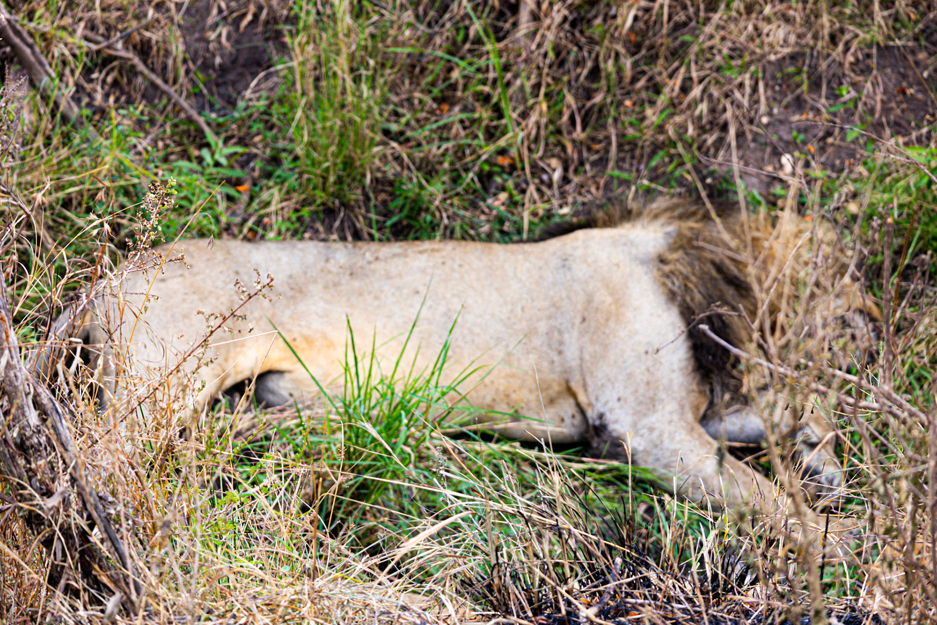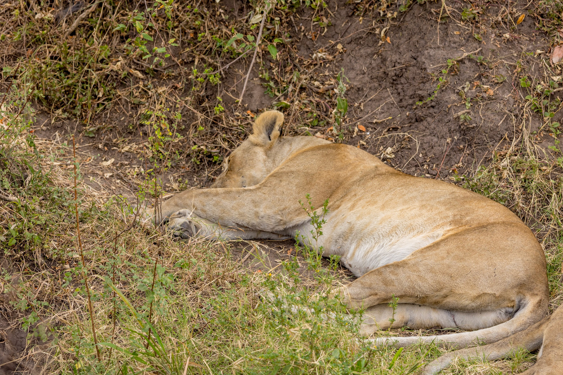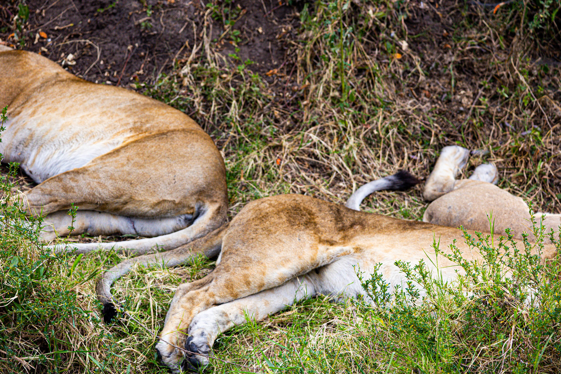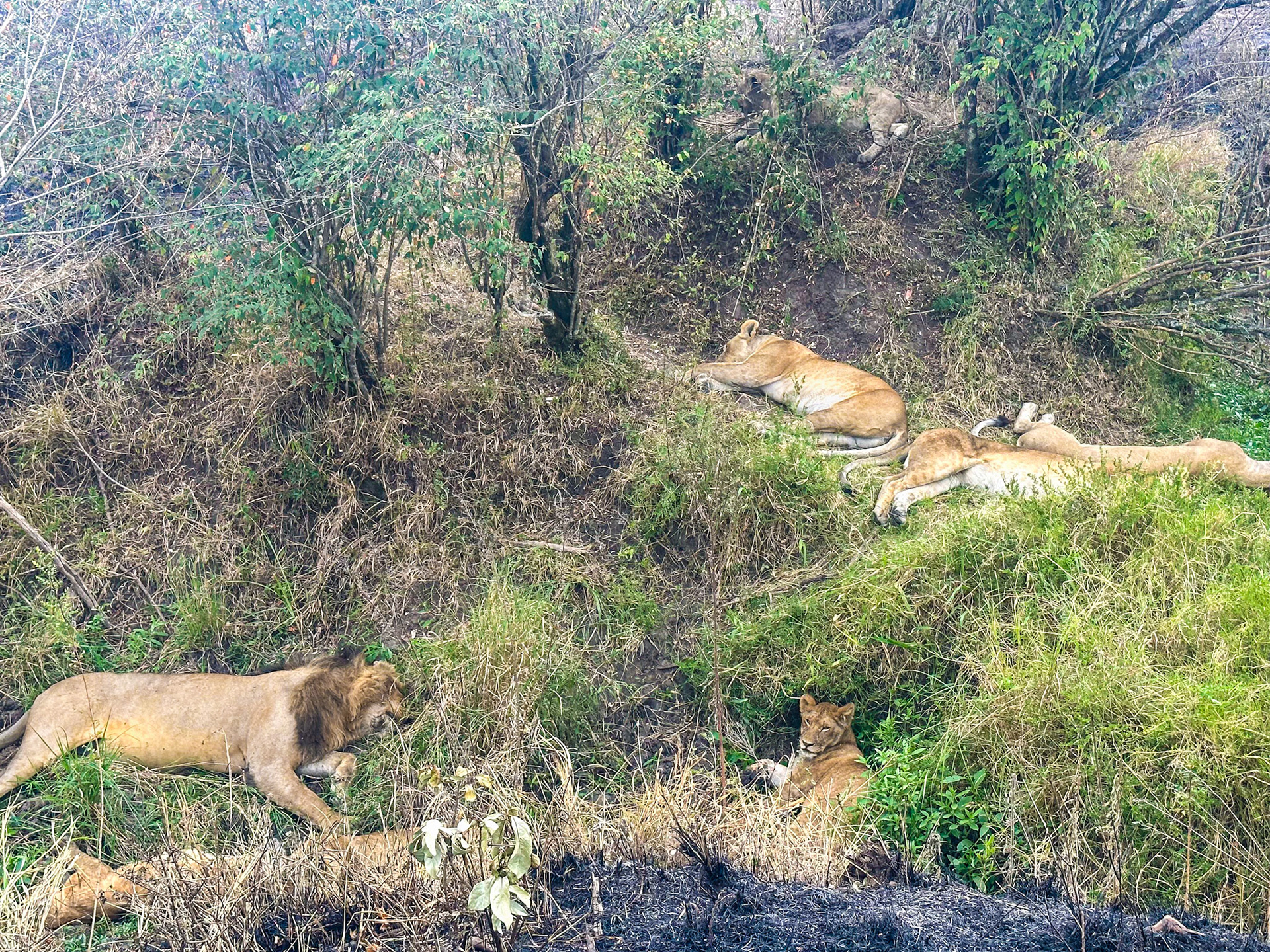 A quartet of lions lounge leisurely in the foreground, unbeknownst to the giraffes feasting on bushes further back. An elephant ambles in the distance, tying together a captivating scene of Kenyan wildlife.