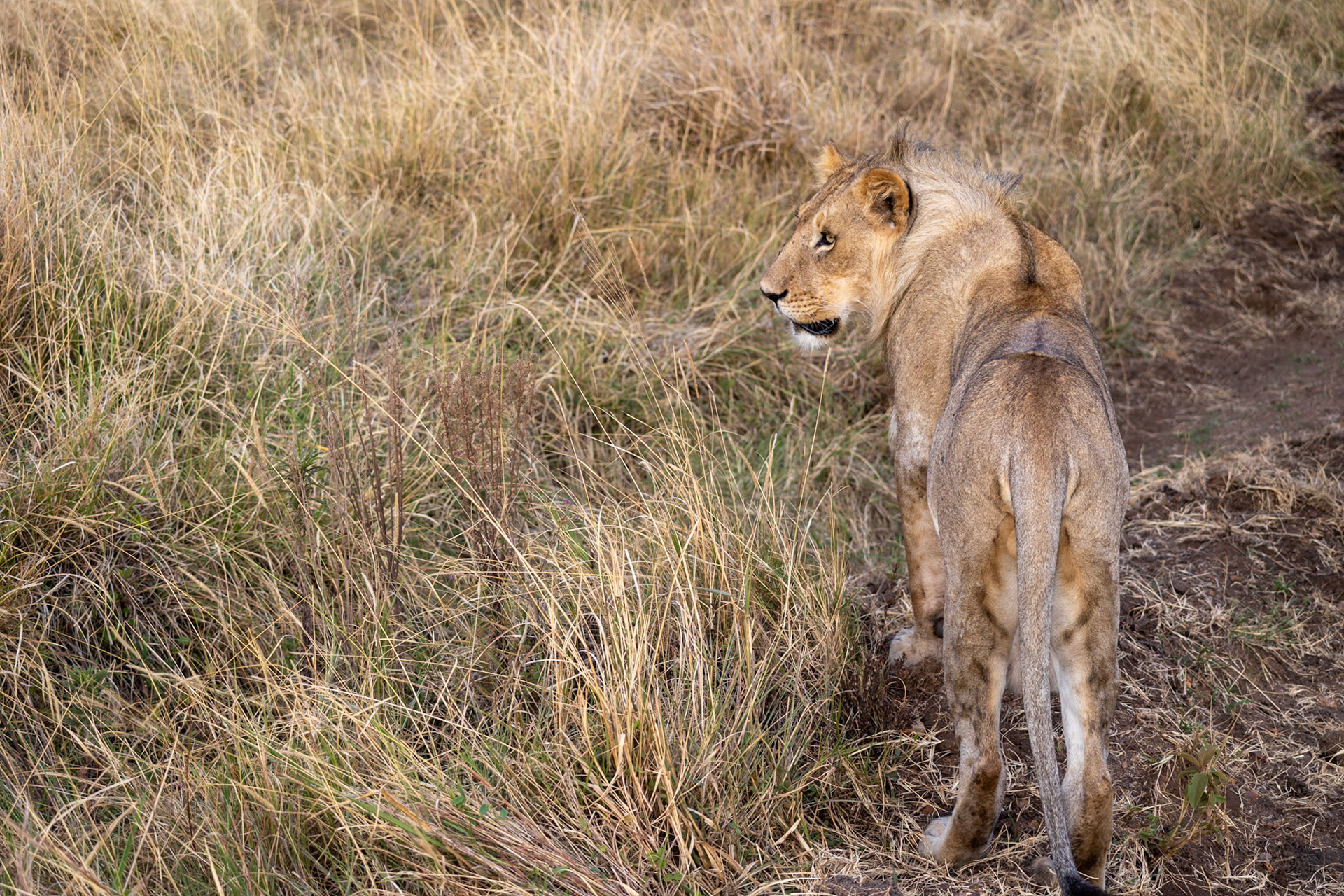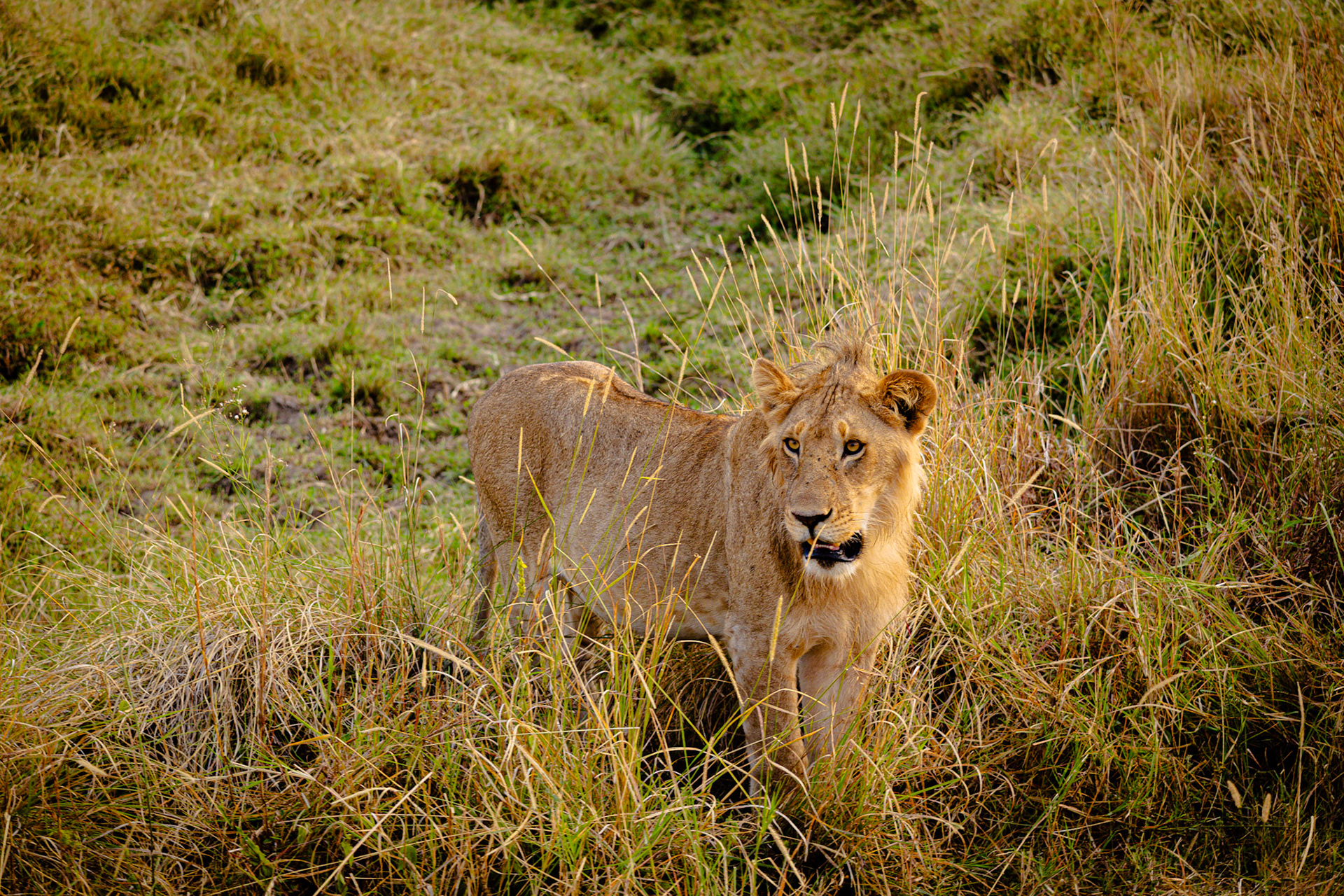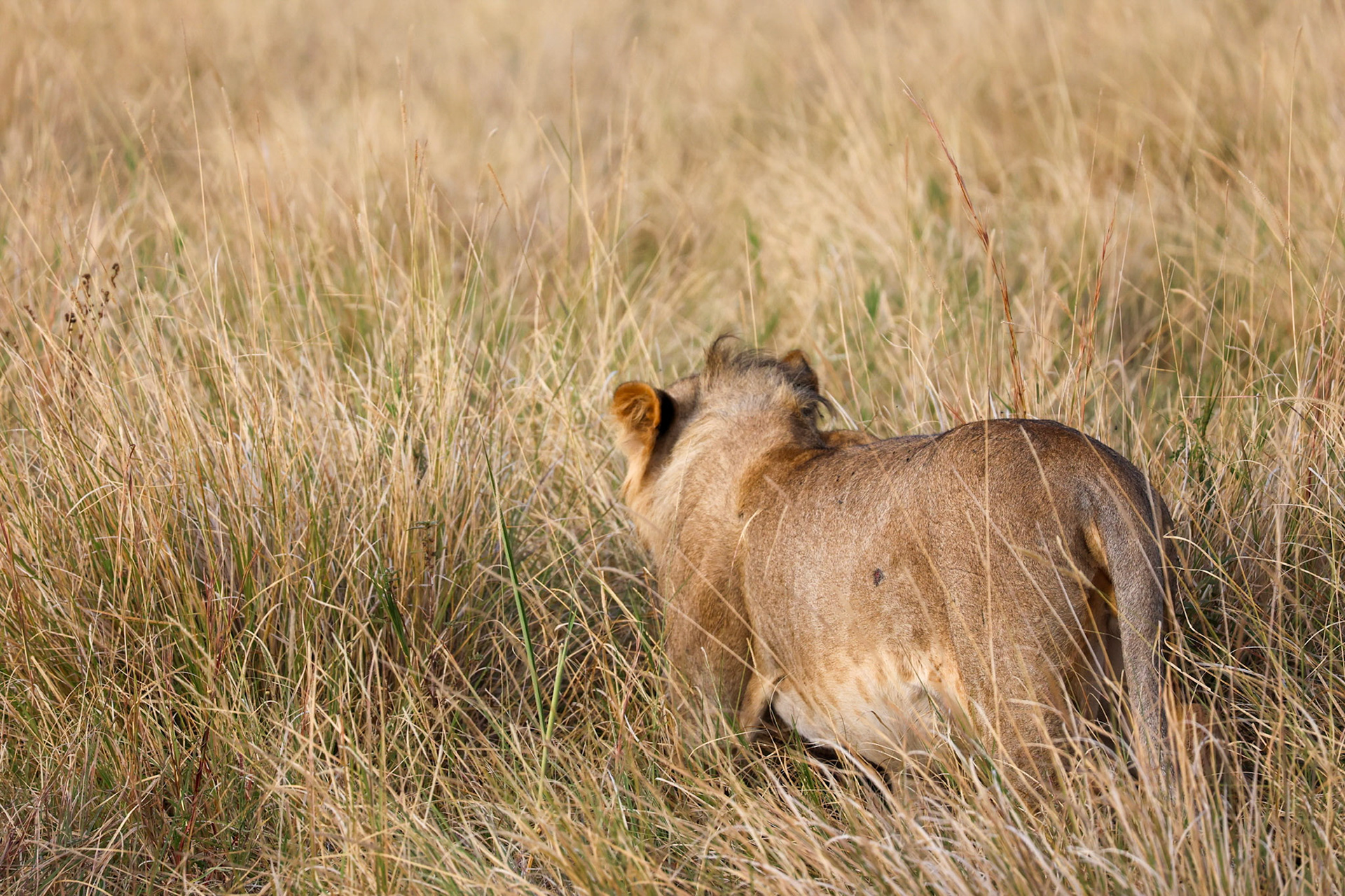 A young male lion, his coat blending seamlessly with the tall grass, masters the art of the stealthy approach.