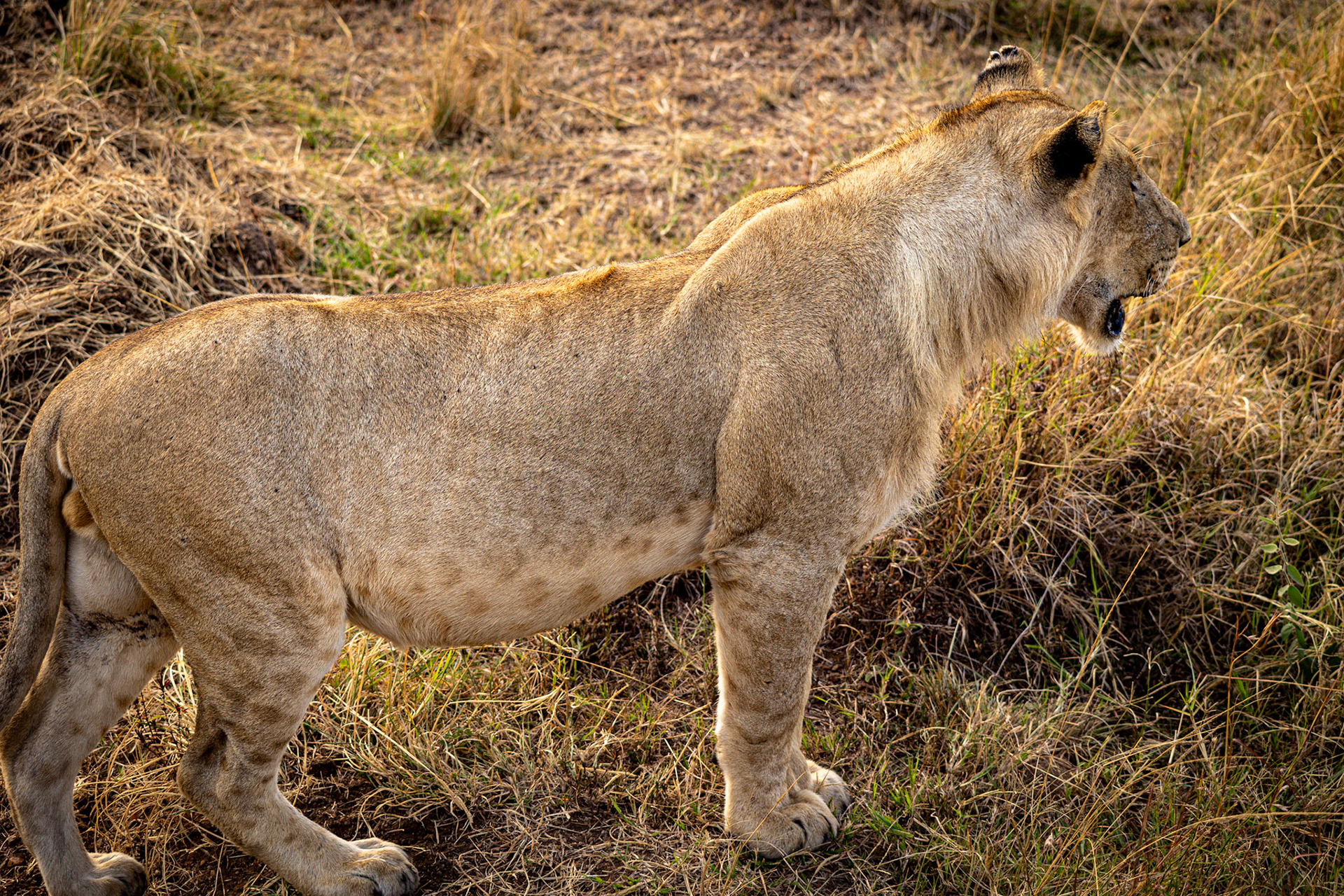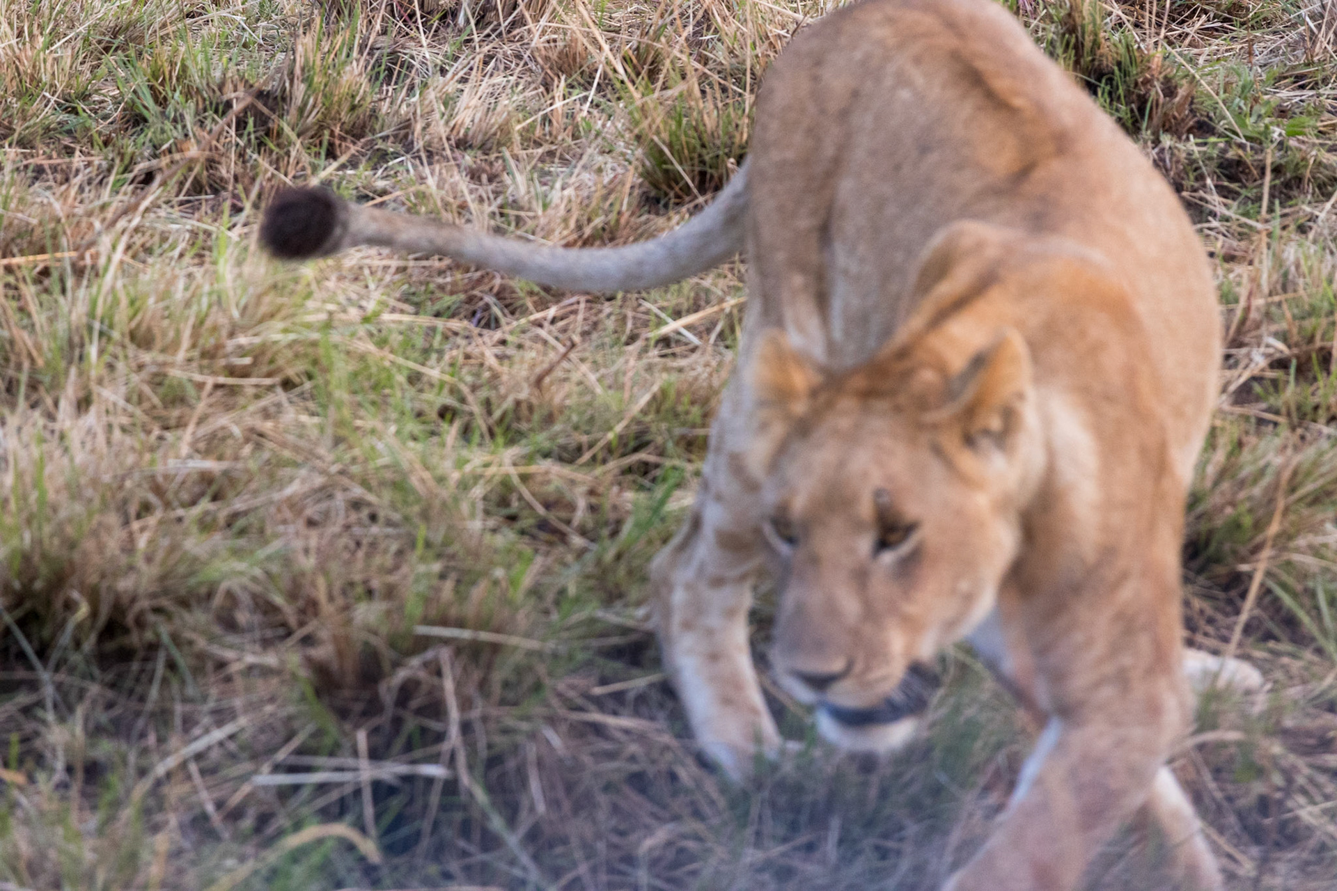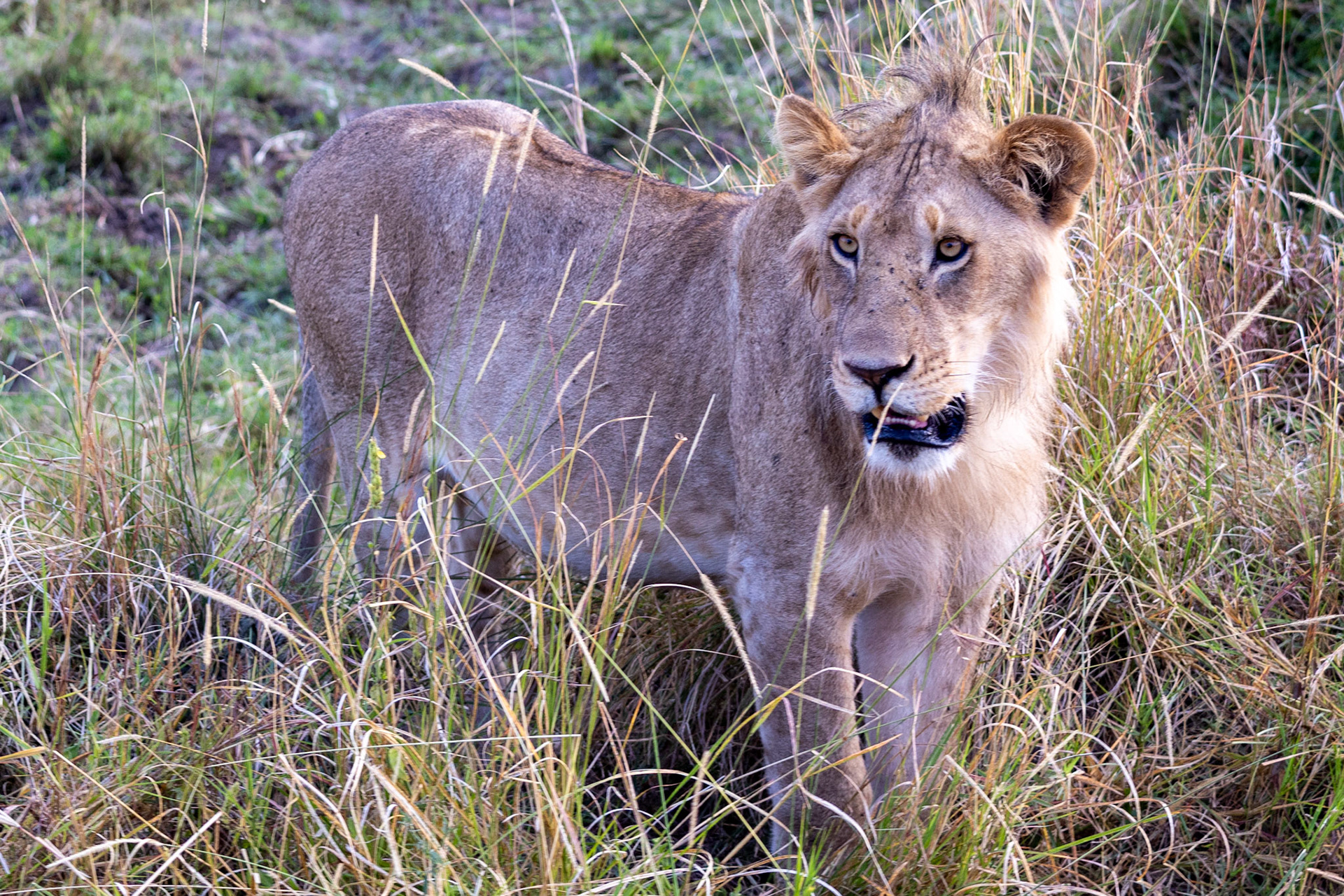 A young male lion, his coat blending seamlessly with the tall grass, masters the art of the stealthy approach.