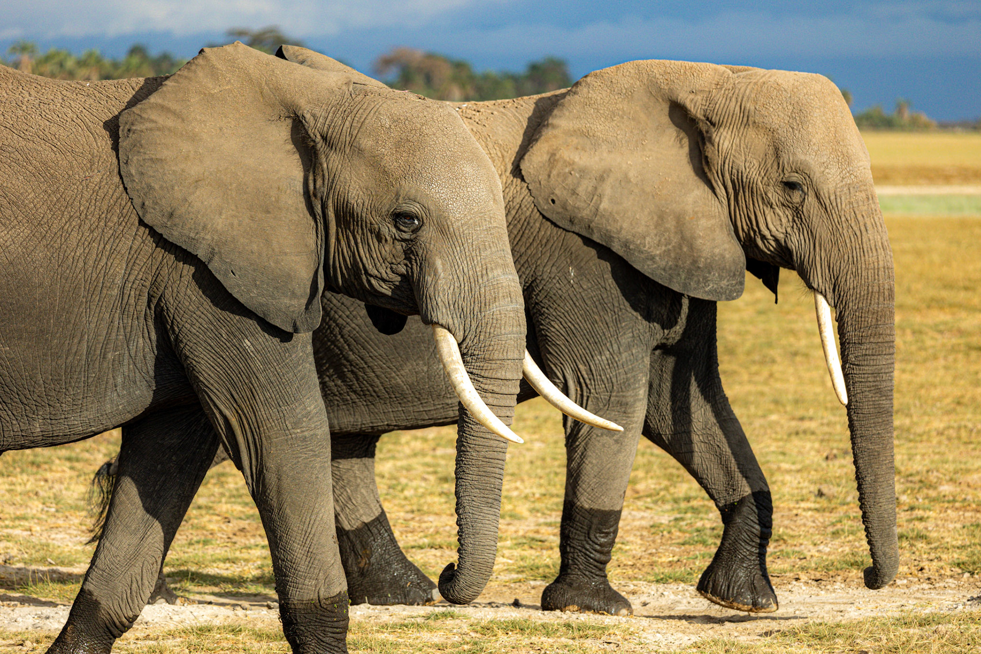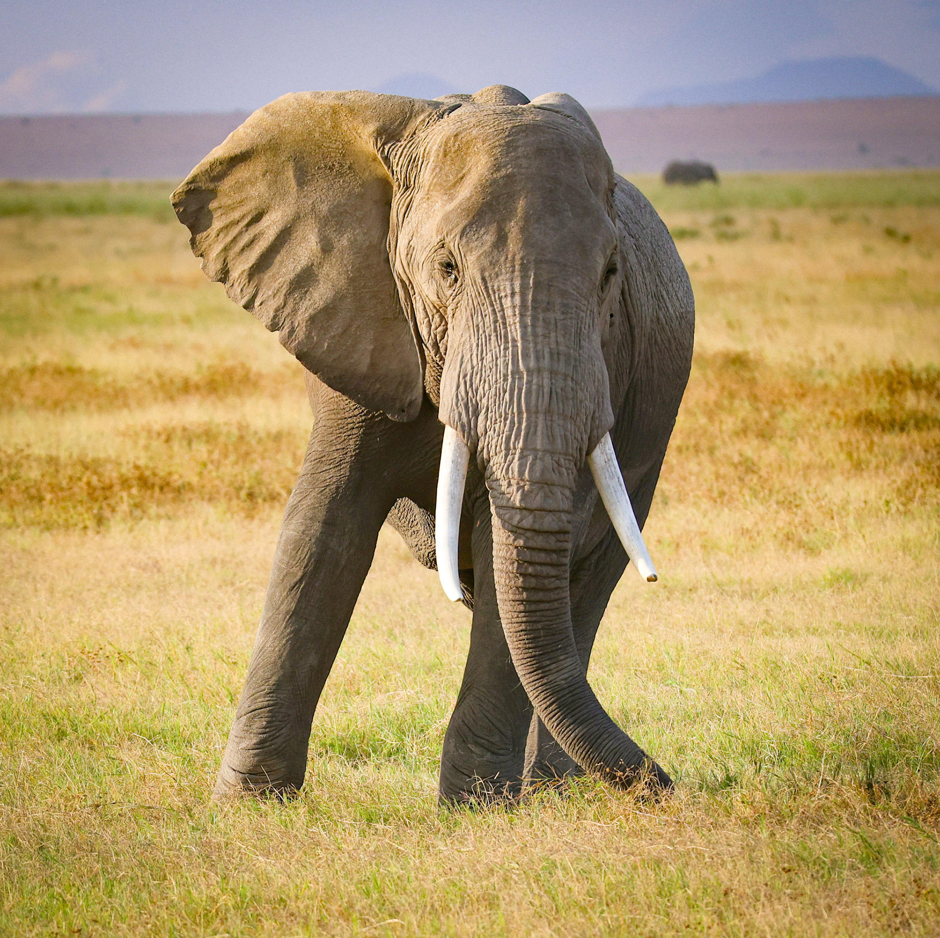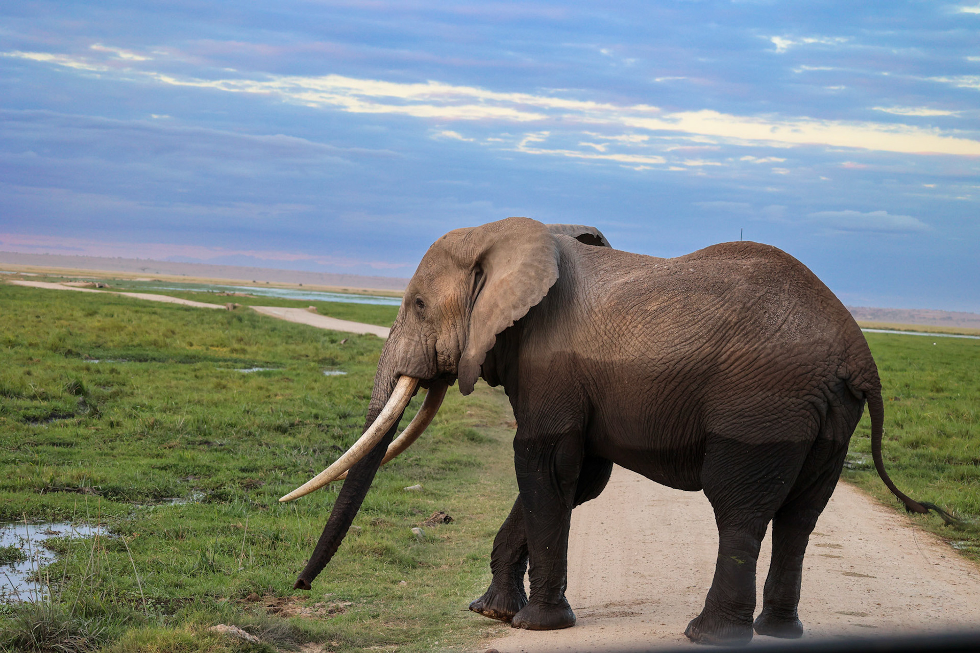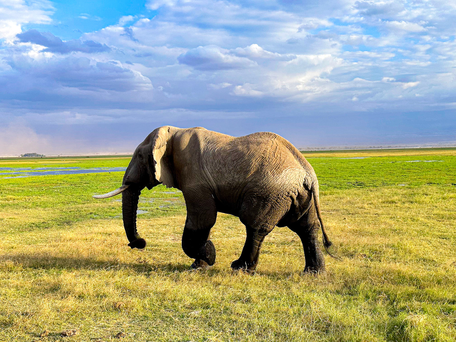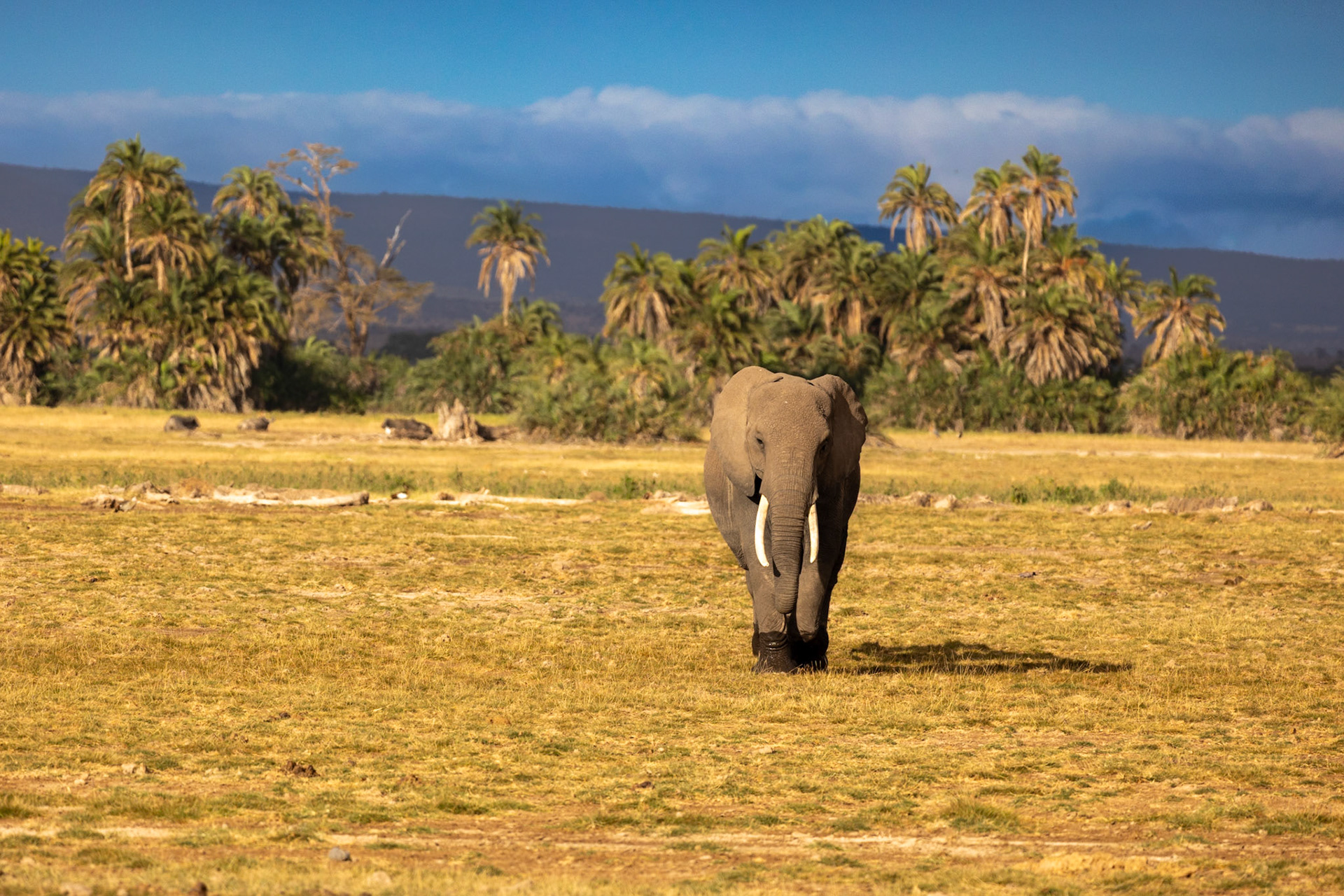 A majestic elephant, characterized by his grand tusks, marches with singular focus across the natural tapestry of Amboseli, exuding both power and grace.