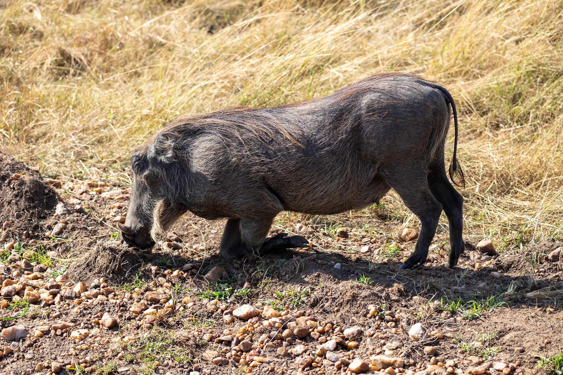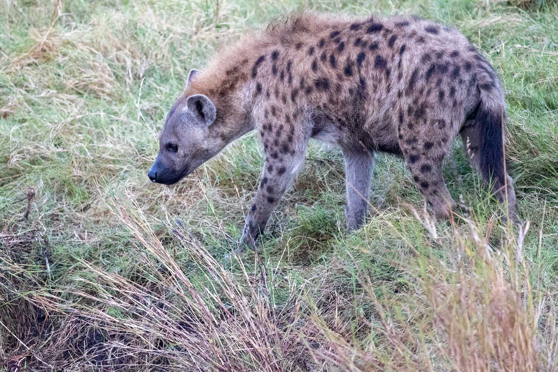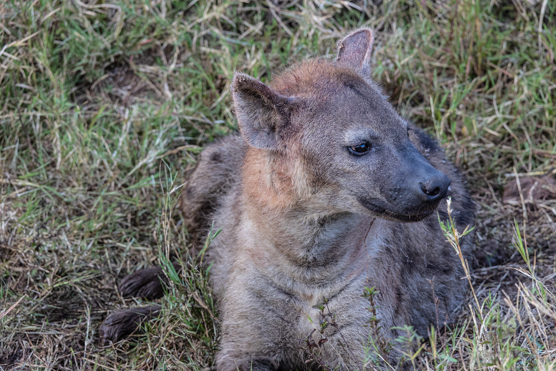 A hyena at rest by the roadside, her gaze calm and contemplative amidst the Maasai Mara grasslands.