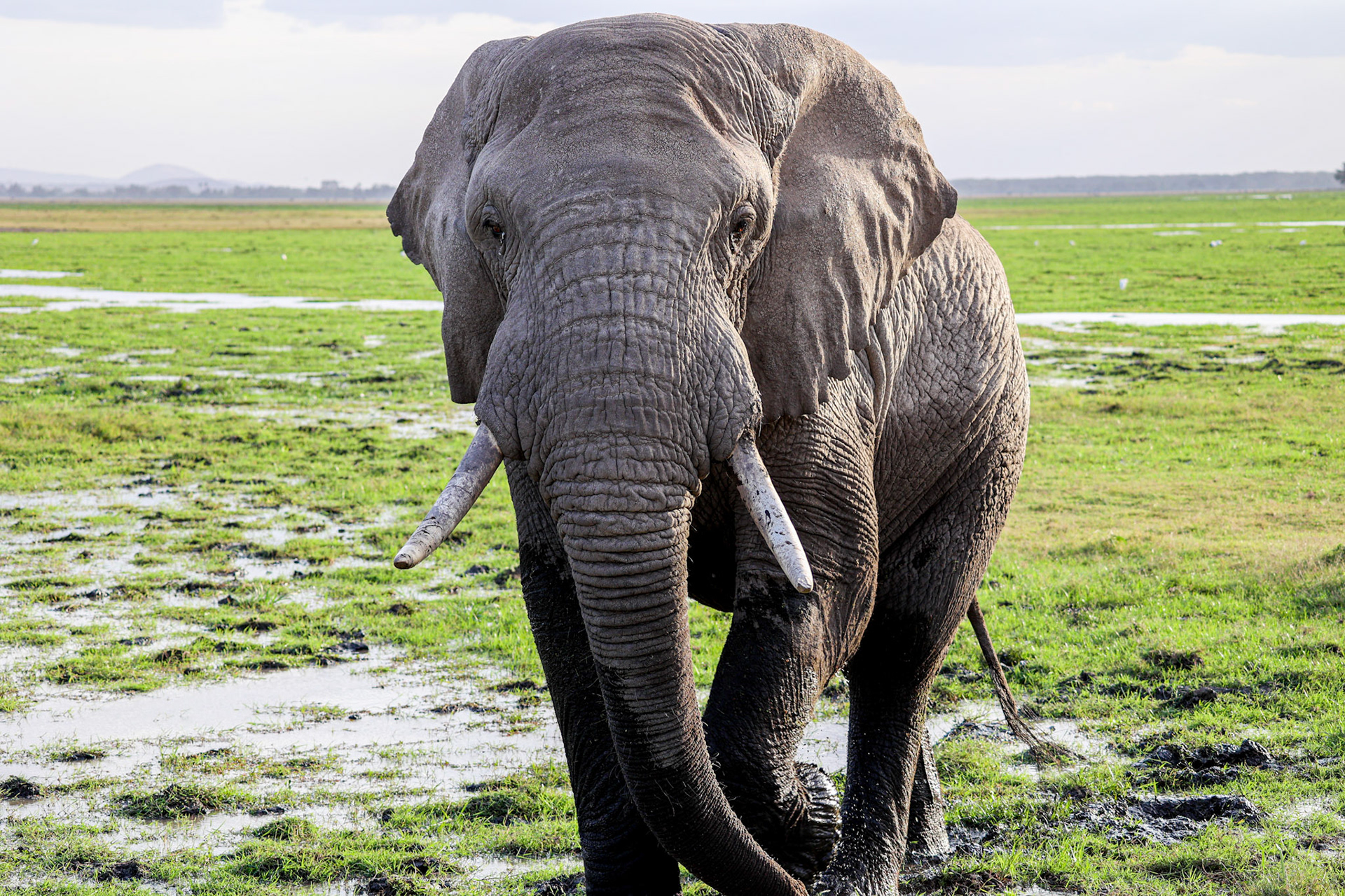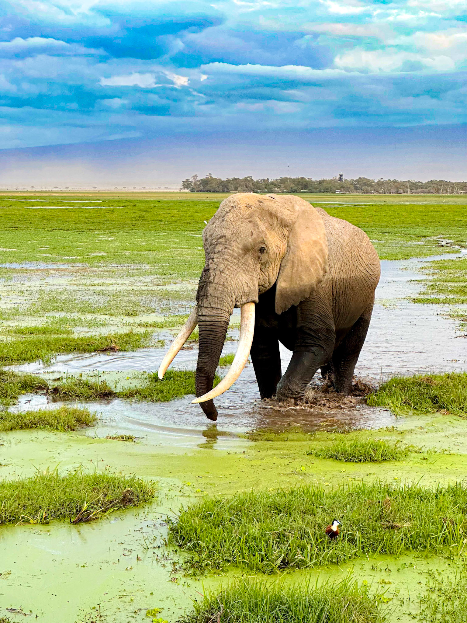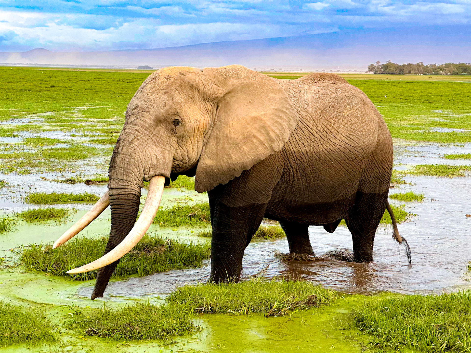 A majestic elephant, endowed with colossal tusks, stands dominantly in the midst of Amboseli's water-filled green savannah. The landscape, a blend of mud and marsh, only amplifies the creature's raw and unparalleled power.