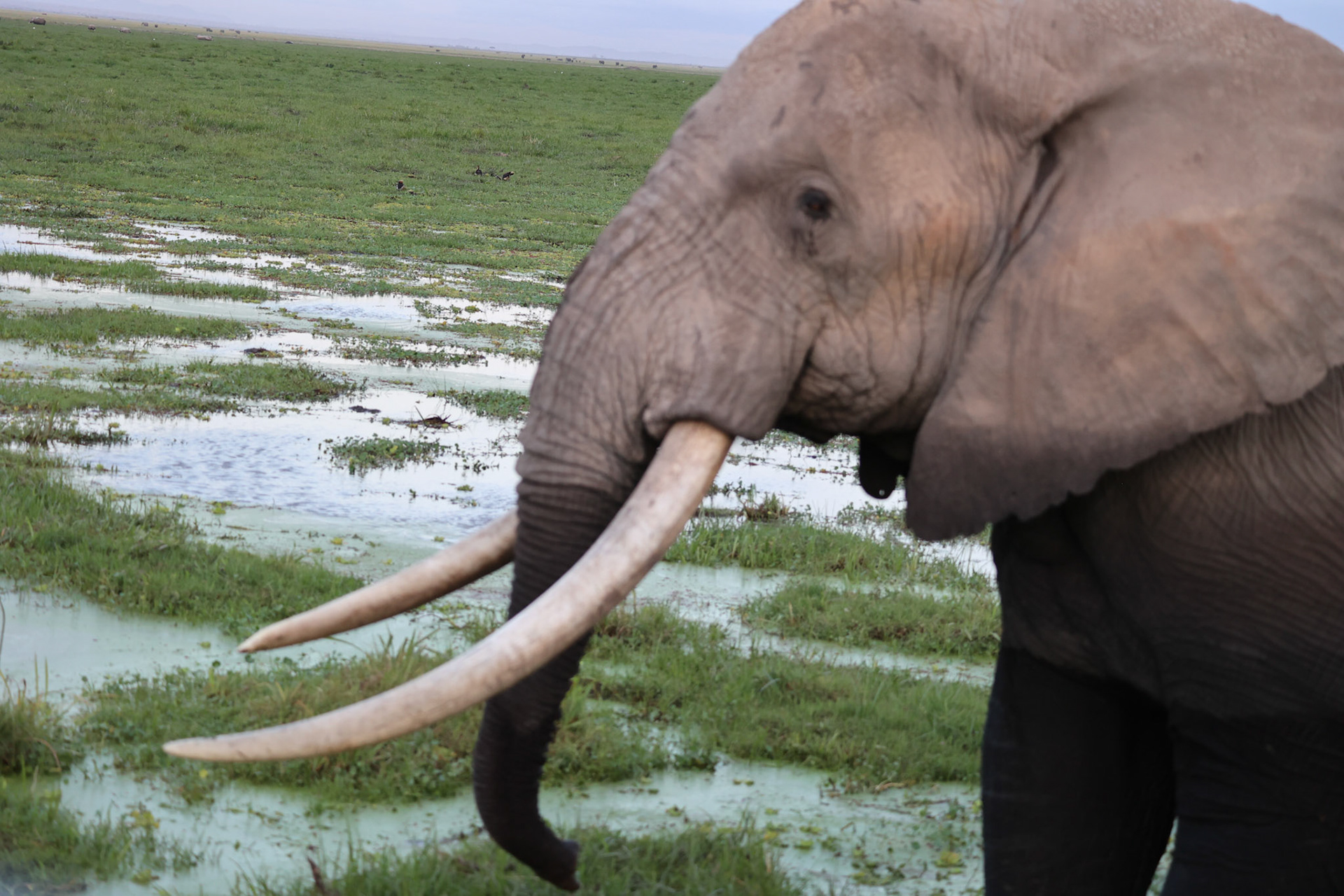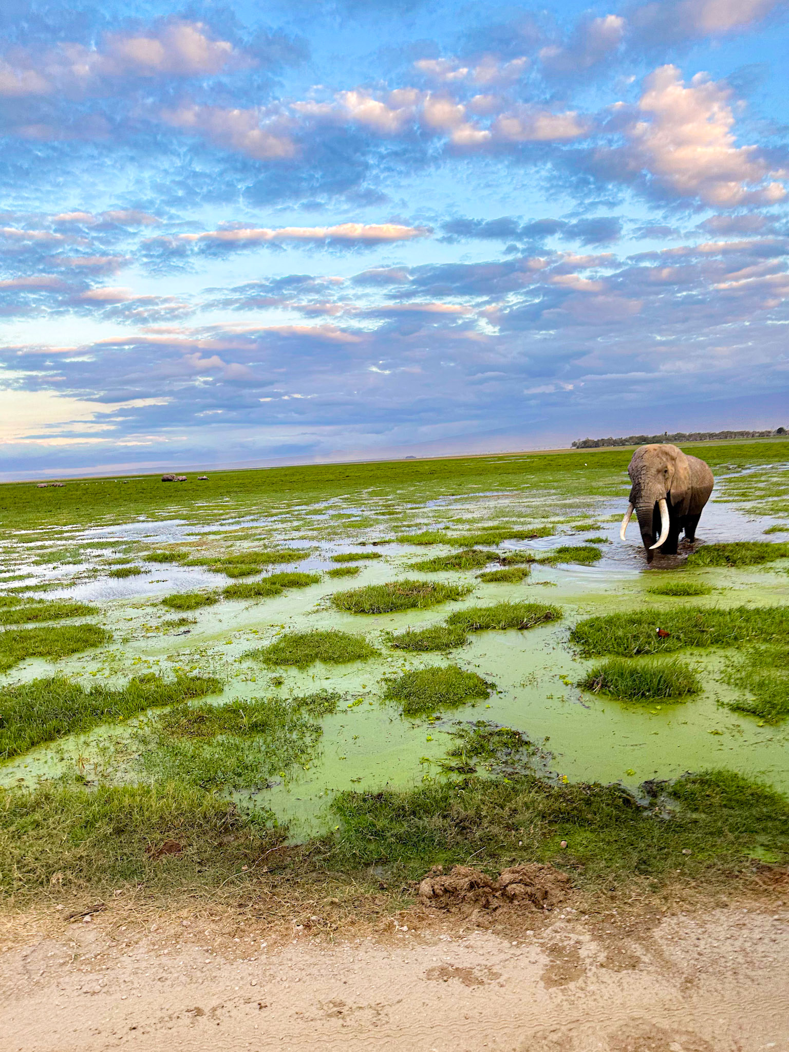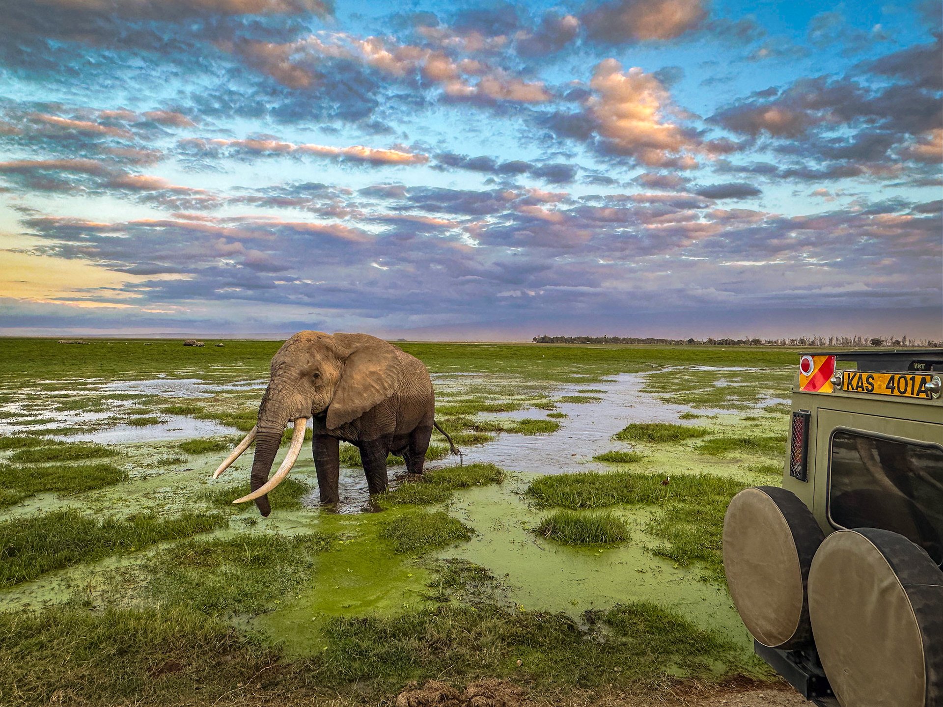 A majestic elephant, endowed with colossal tusks, stands dominantly in the midst of Amboseli's water-filled green savannah. The landscape, a blend of mud and marsh, only amplifies the creature's raw and unparalleled power.
