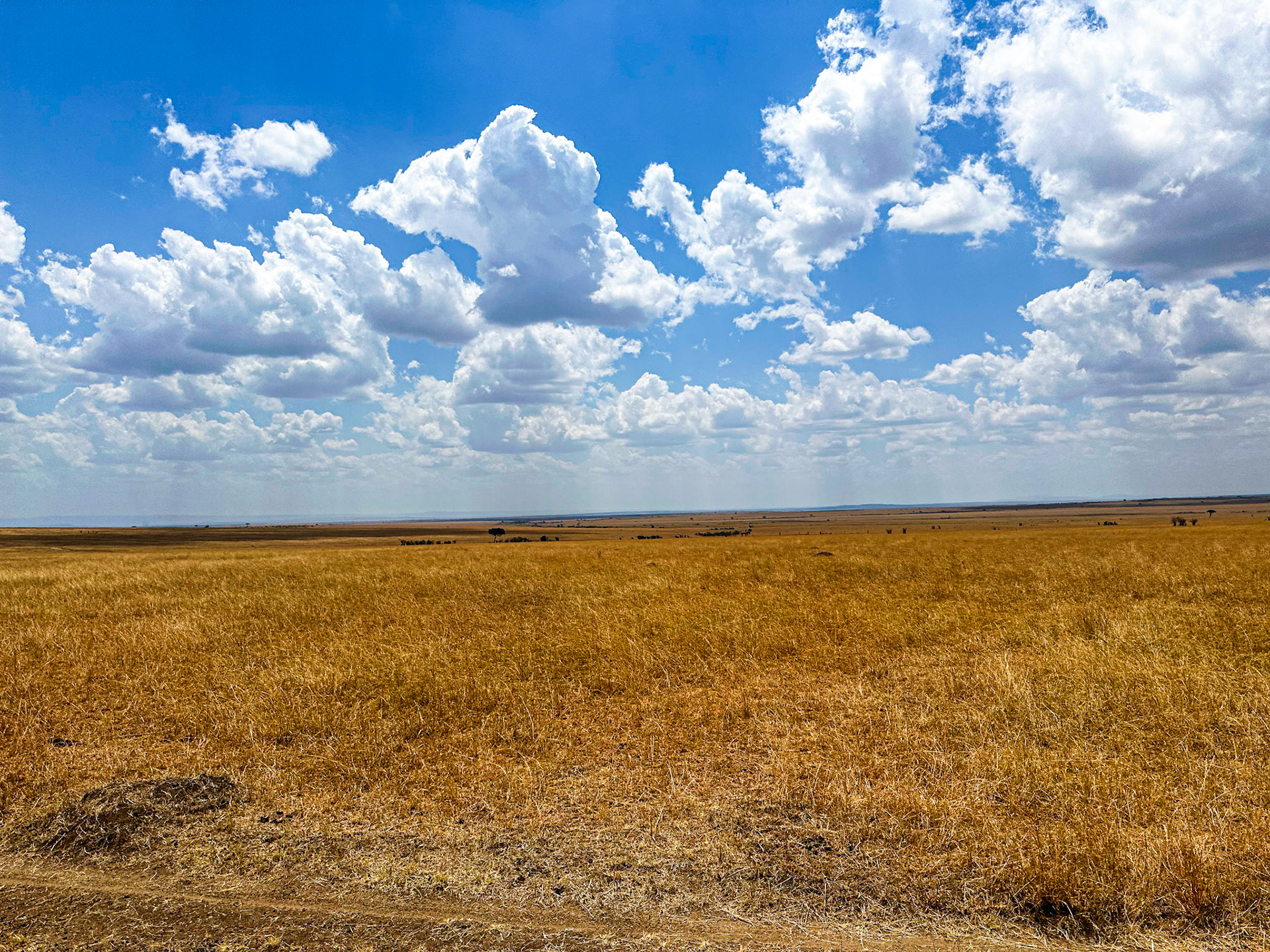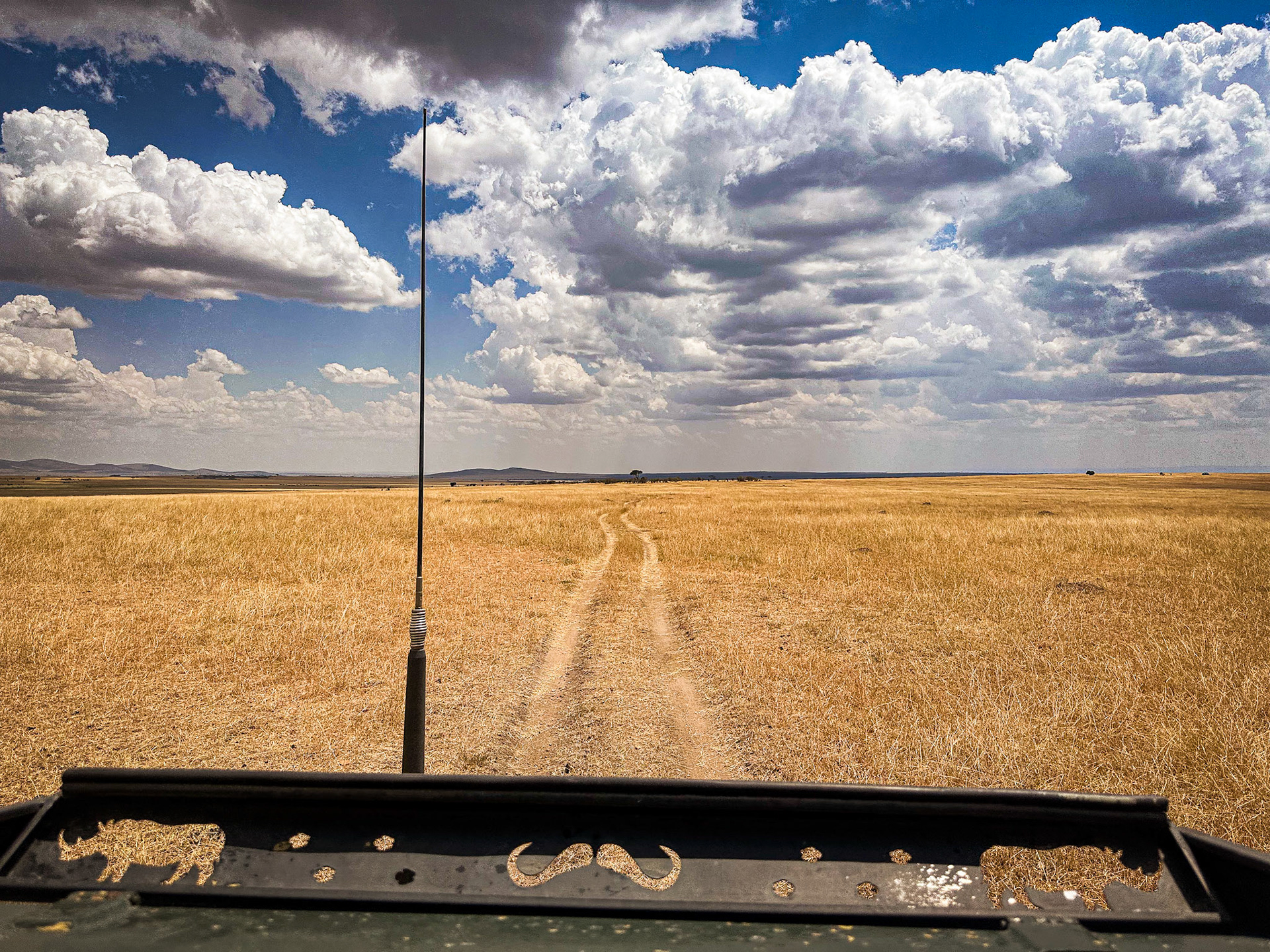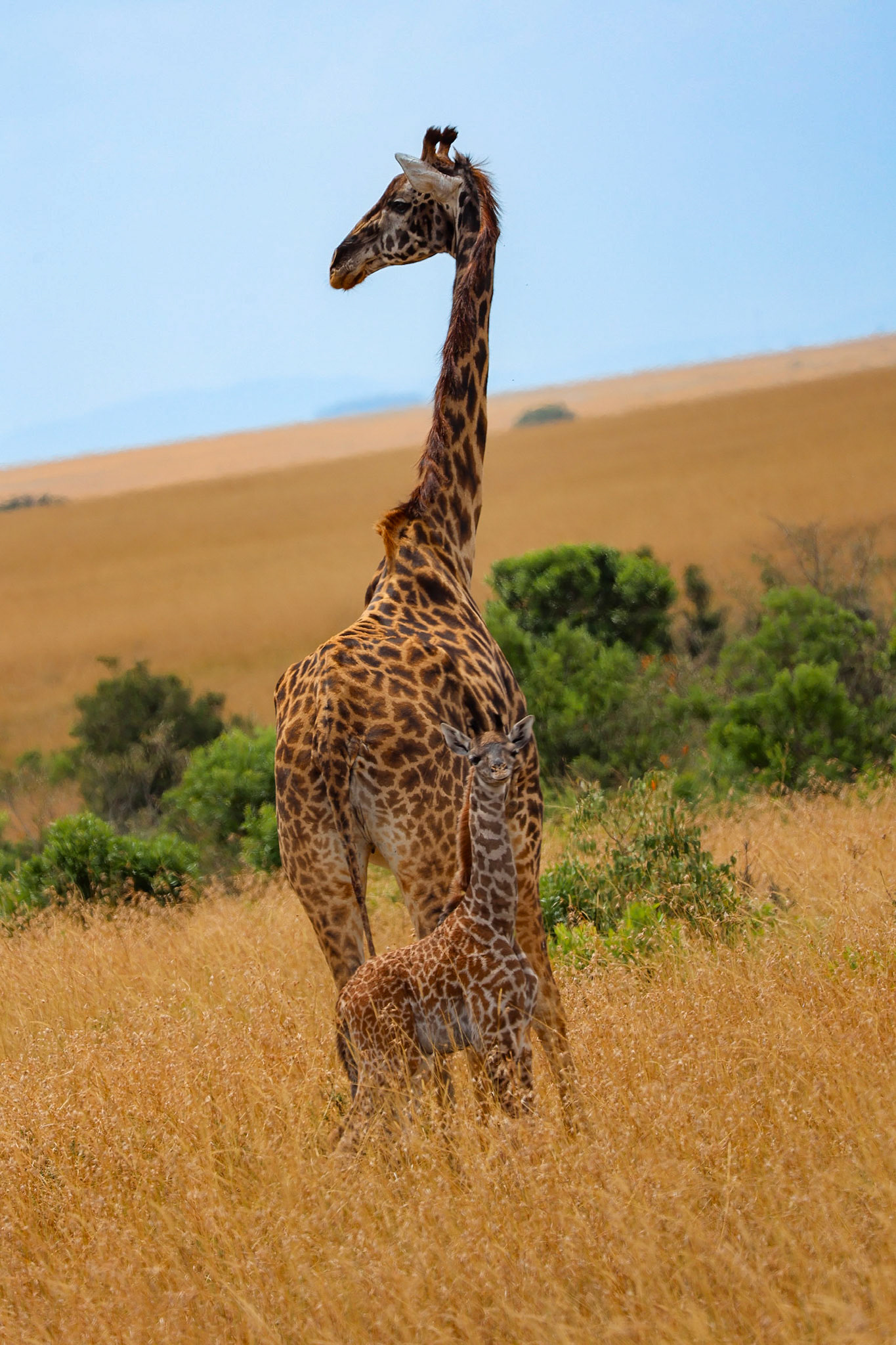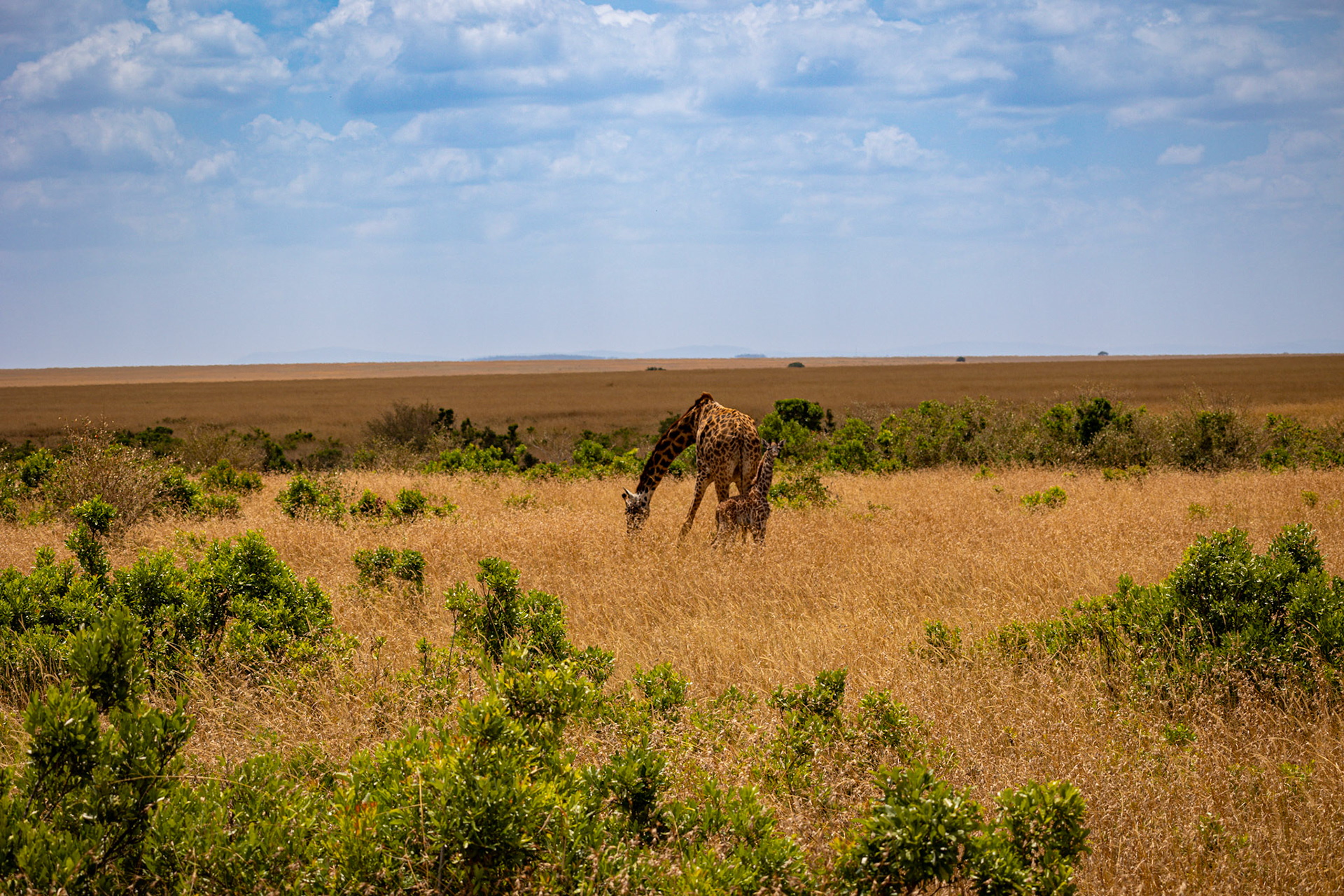 Endless horizons in Maasai Mara with a special mother and baby giraffe moment captured in its vastness.
