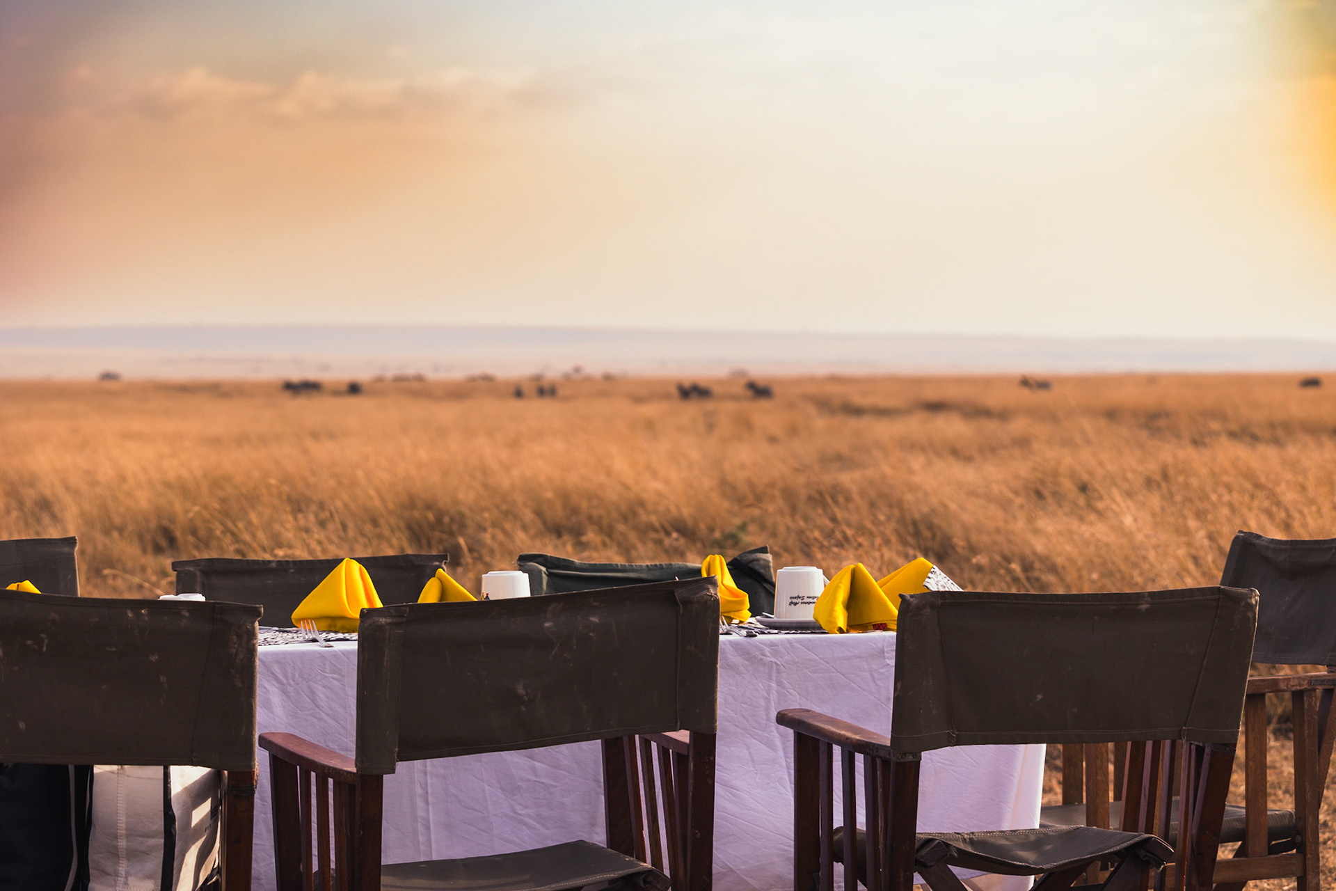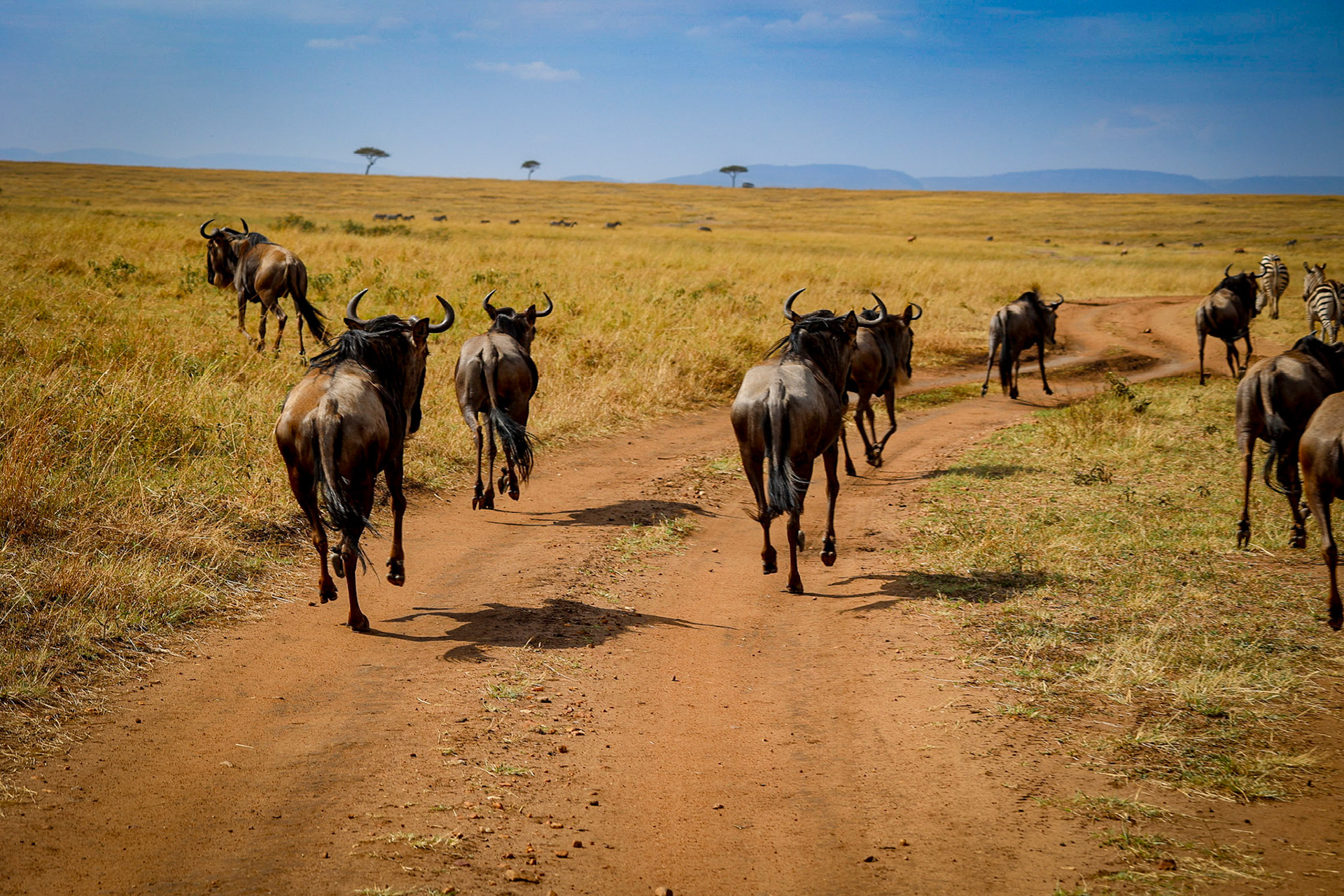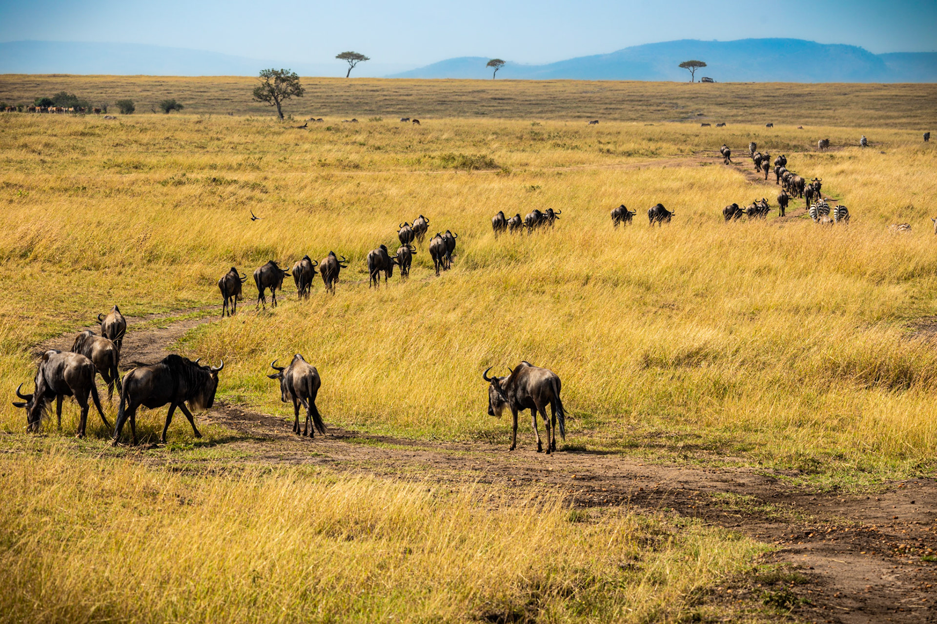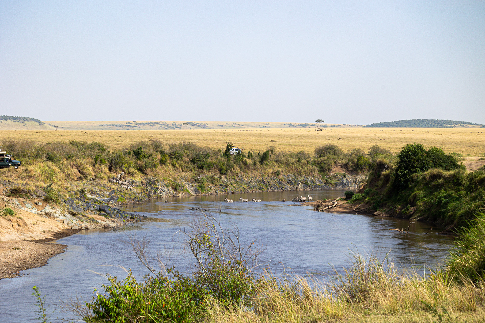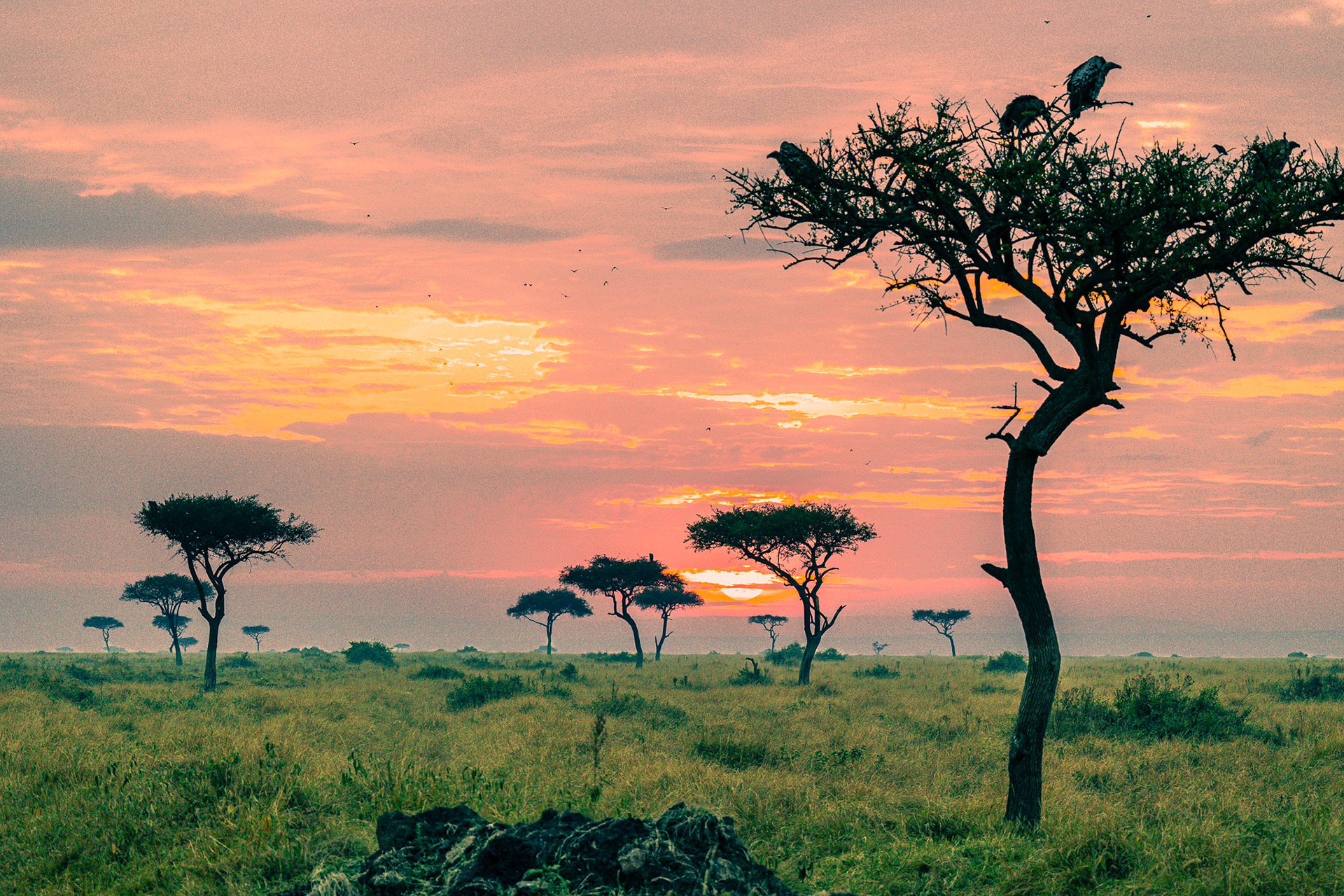 Endless horizons in Maasai Mara with a special mother and baby giraffe moment captured in its vastness.