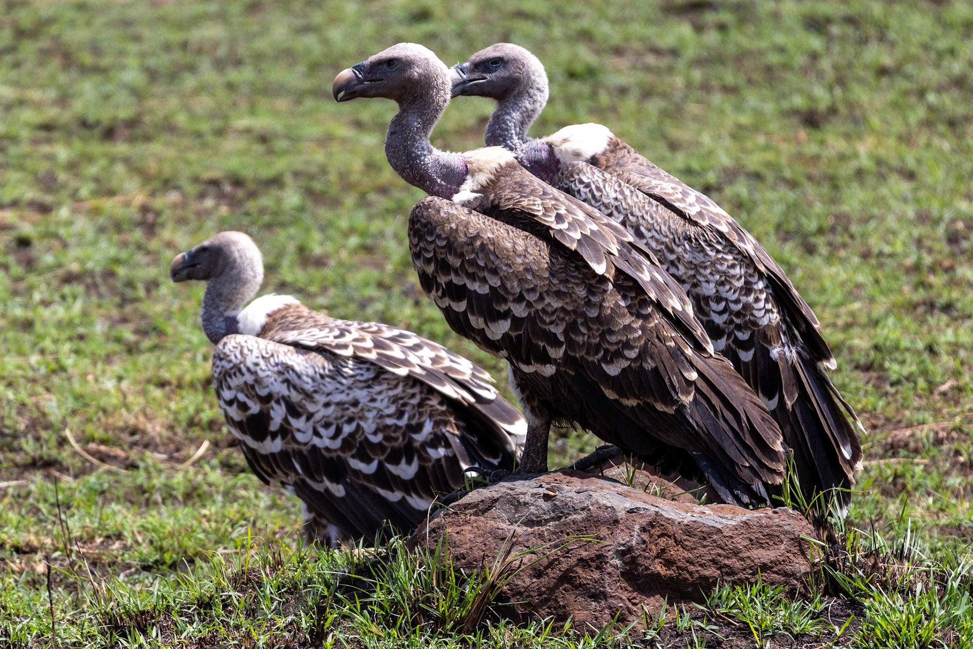 Three ostriches journey together, their silhouettes standing out against the expansive savannah backdrop. The horizon stretches infinitely behind them, with the yellow-greenish grass painting a picture of nature's vastness.