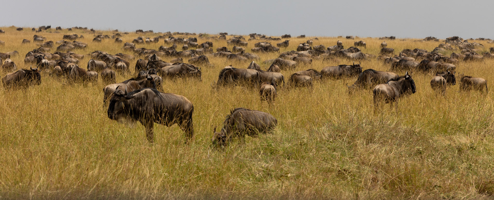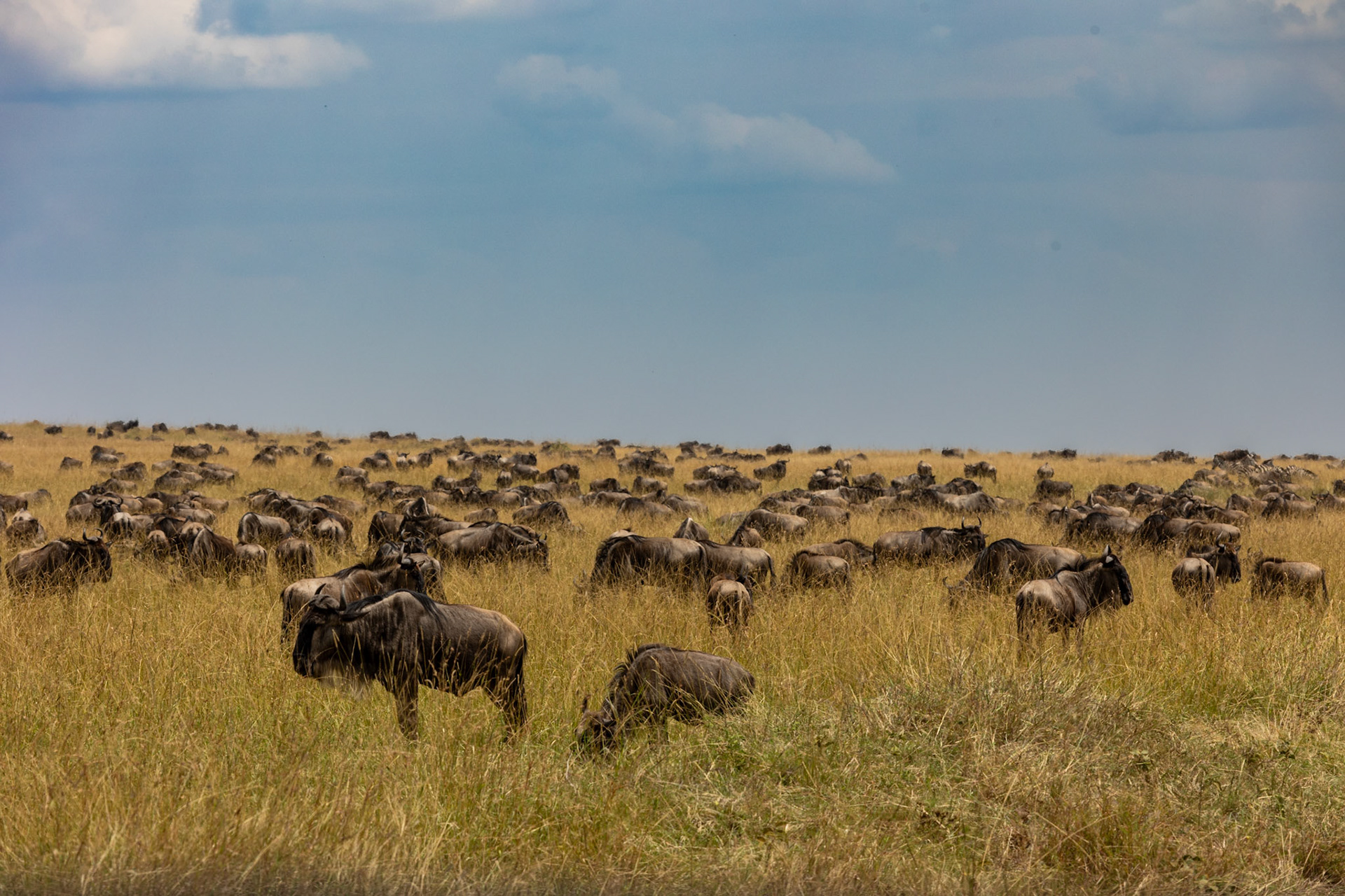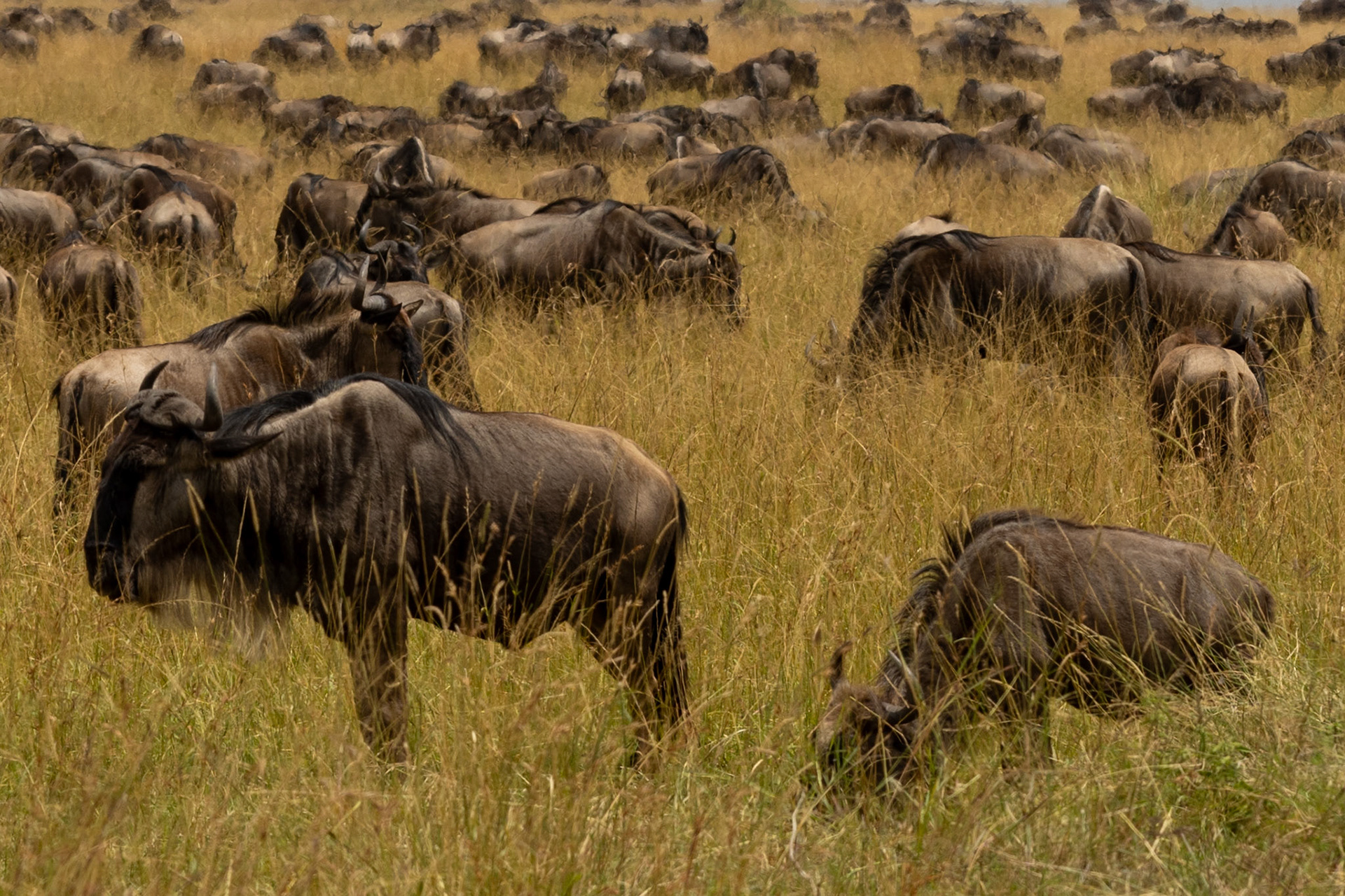 While two wildebeest engage in their hearty meal amidst the verdant plains, others take a moment to rest, painting a peaceful scene of life in the Kenyan wilderness.