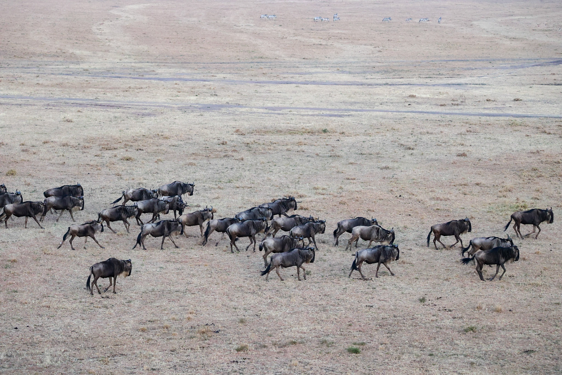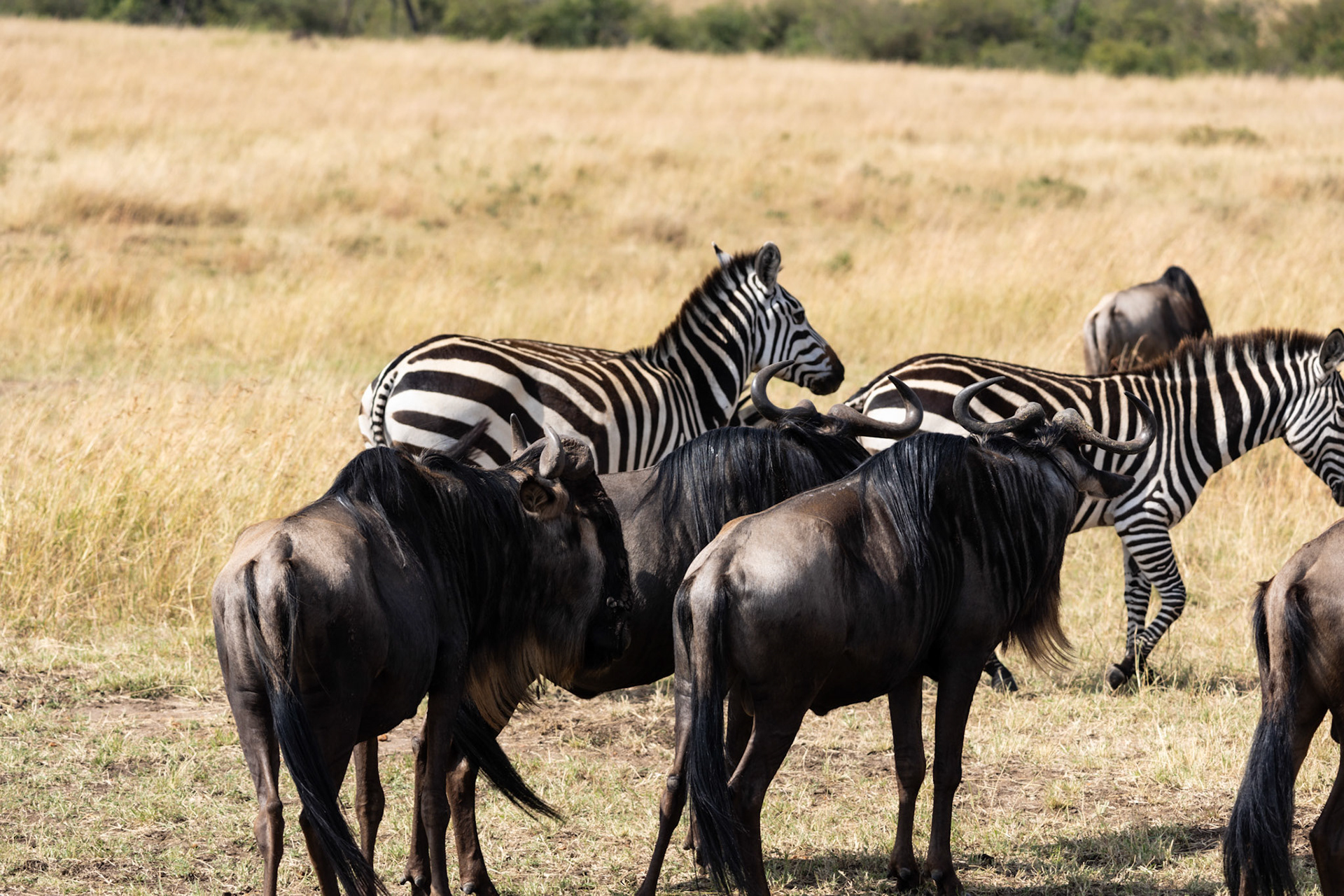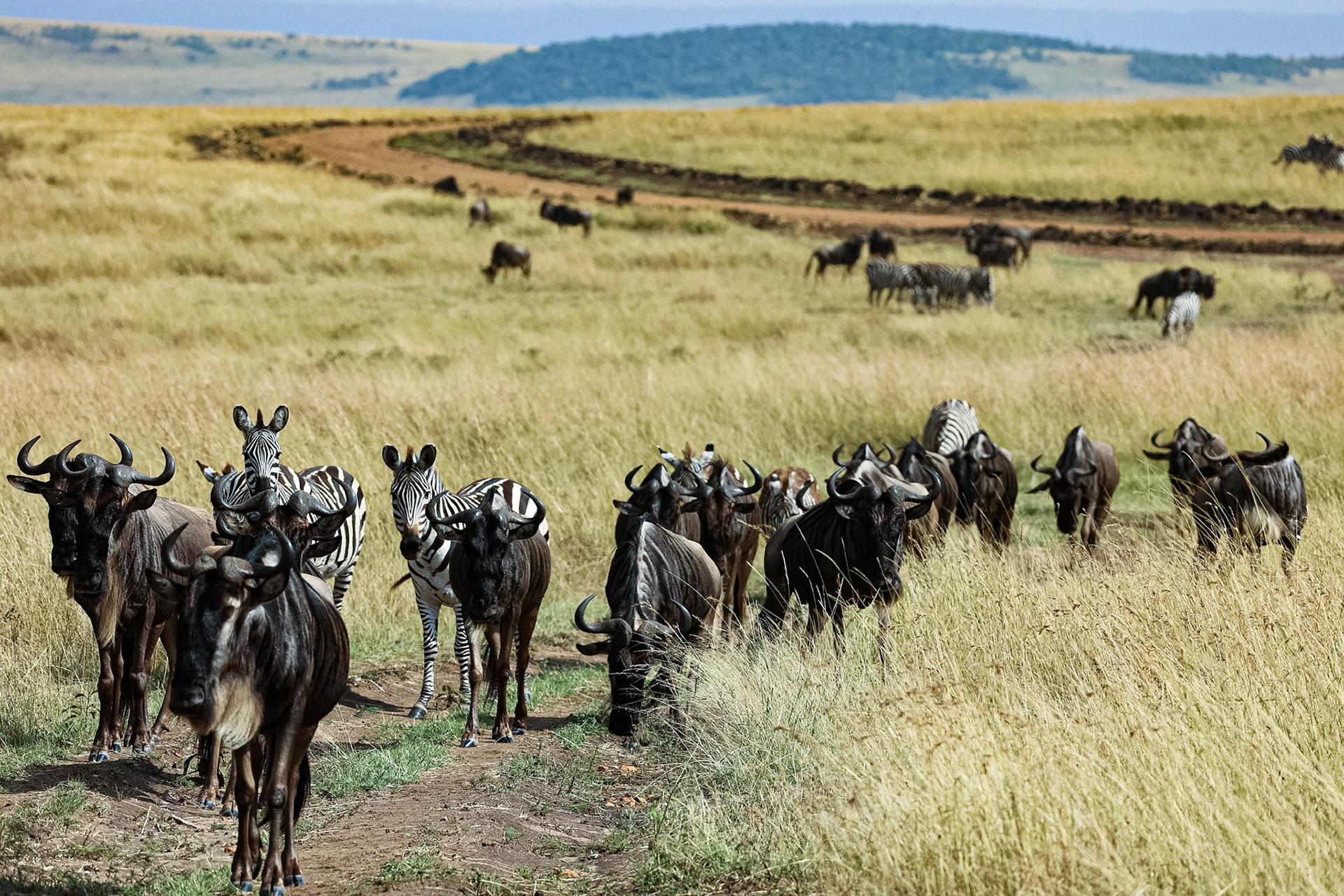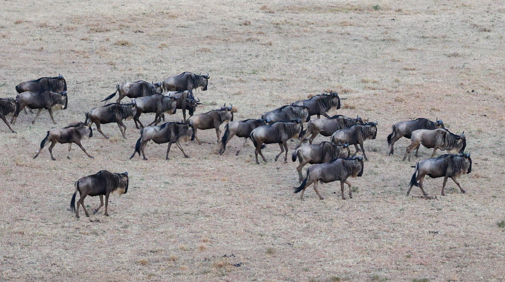 While two wildebeest engage in their hearty meal amidst the verdant plains, others take a moment to rest, painting a peaceful scene of life in the Kenyan wilderness.