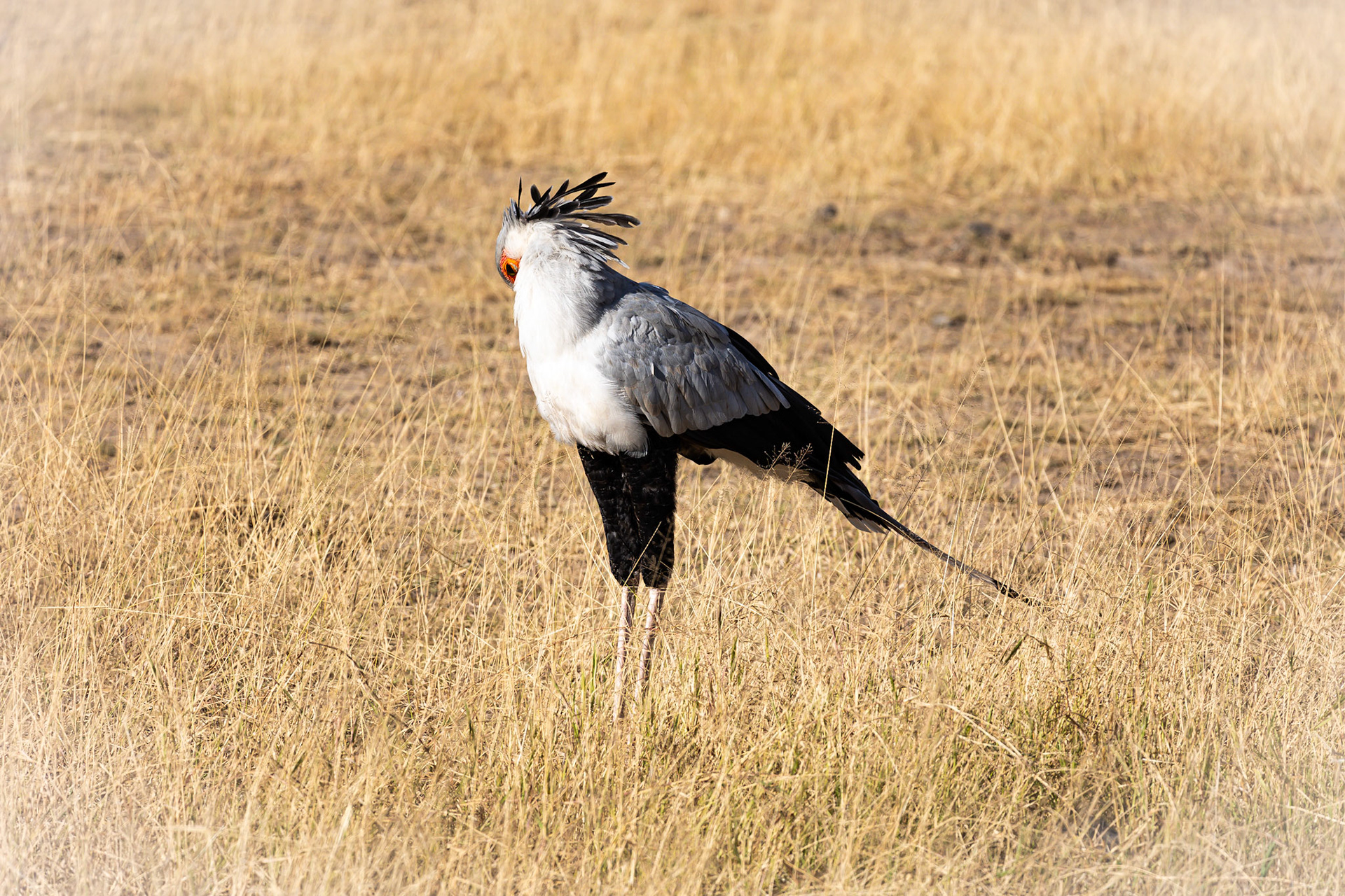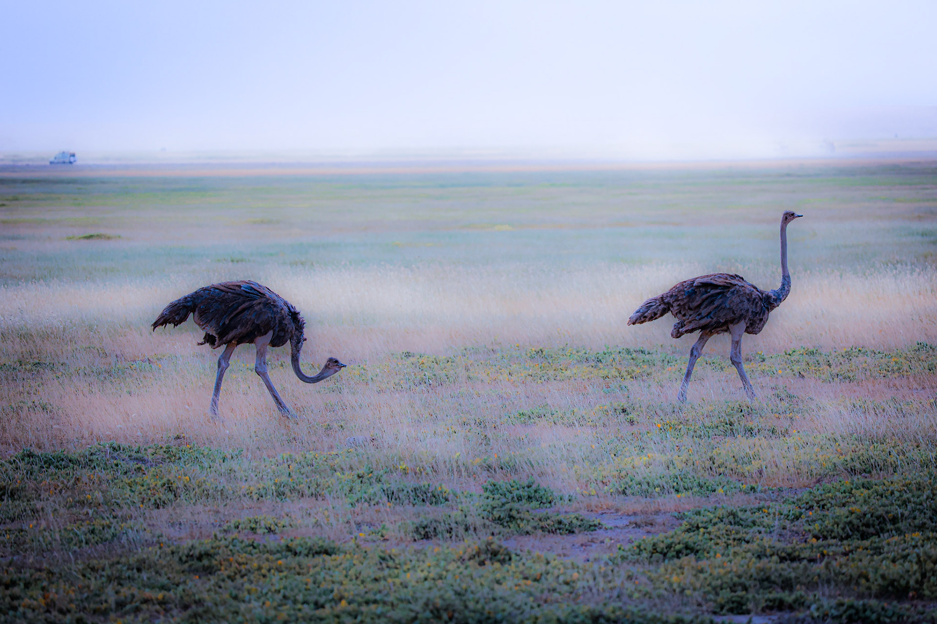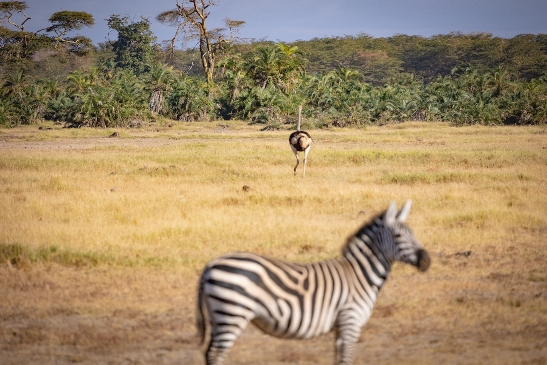 "Under a vast expanse of blue, sun rays pierce the heavens, illuminating the lone ostrich as it strides confidently across the savannah. In the distance, the subtle silhouette of a zebra adds depth and intrigue to this picturesque Amboseli tableau.