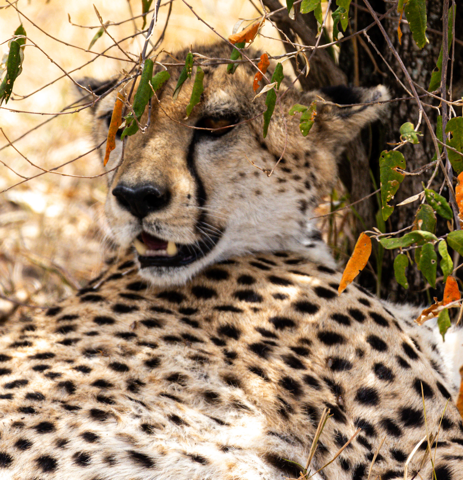 A rare and tranquil sight: a lion, the king of the savannah, finds solace in the branches of a tree, embracing a peaceful slumber high above the ground.