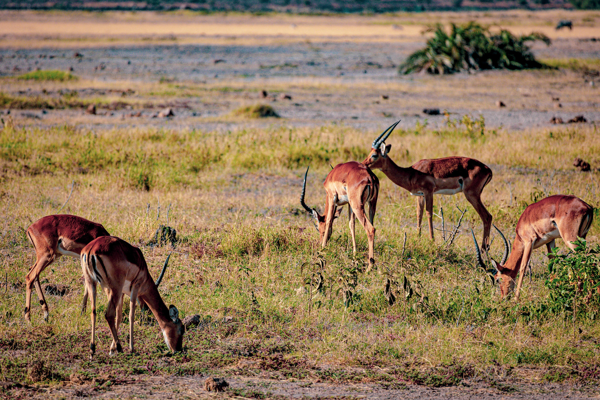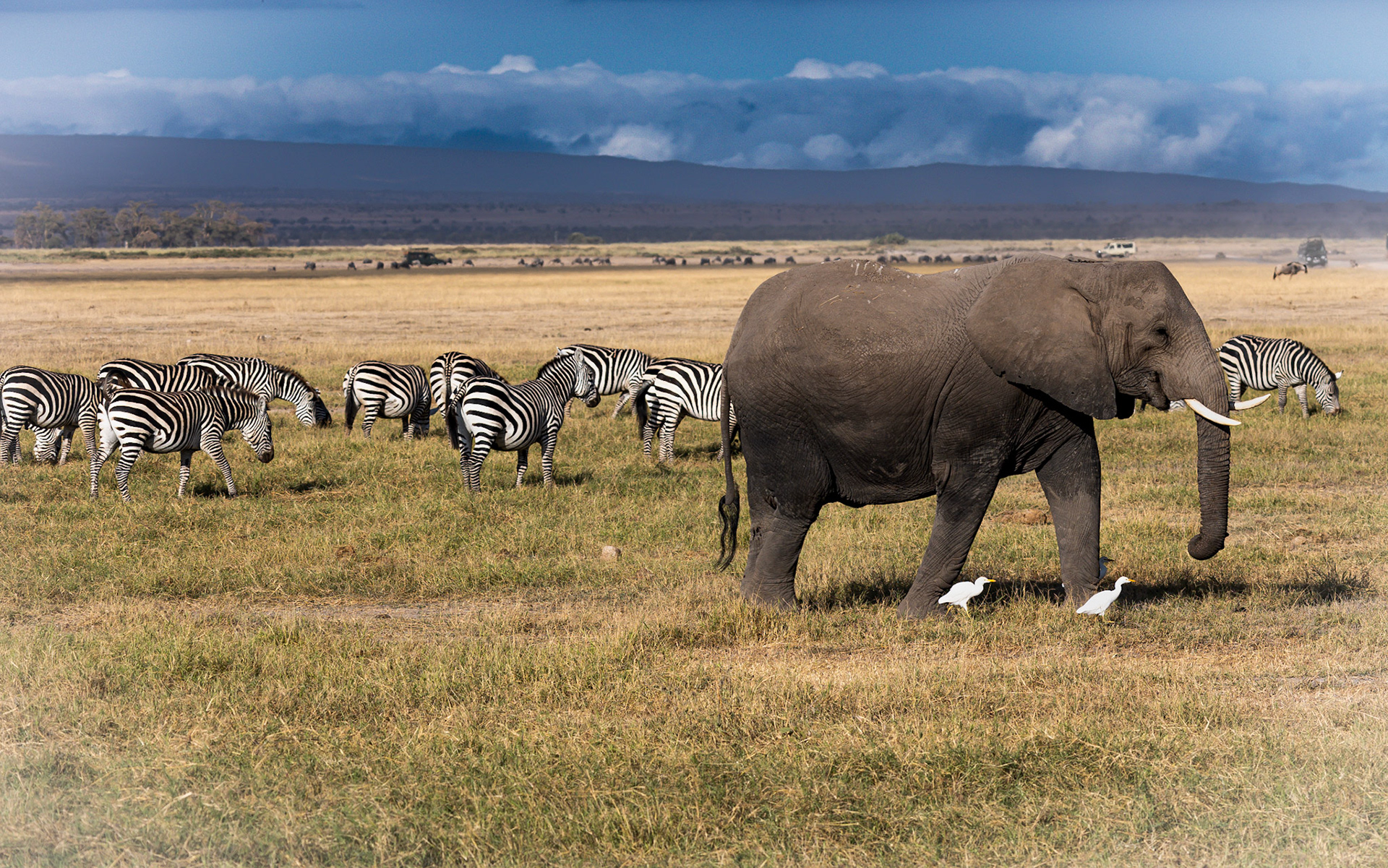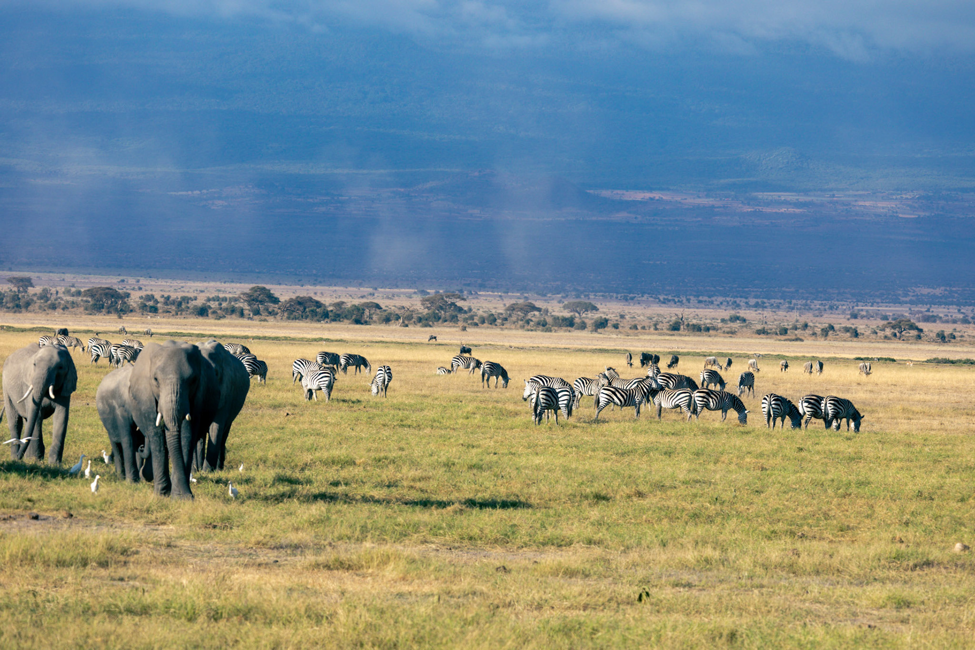 In a moment of pure serendipity, sun rays pierce through the cloud cover, bathing the Amboseli savannah in ethereal light. Elephants graze on the verdant patch amidst the golden grass, while antelopes and other denizens of the plains play their part in this mesmerizing tableau.