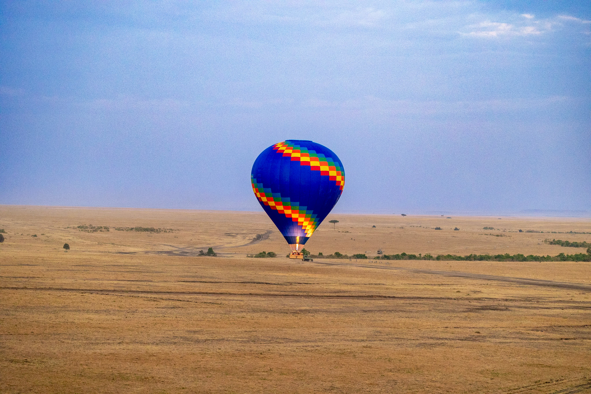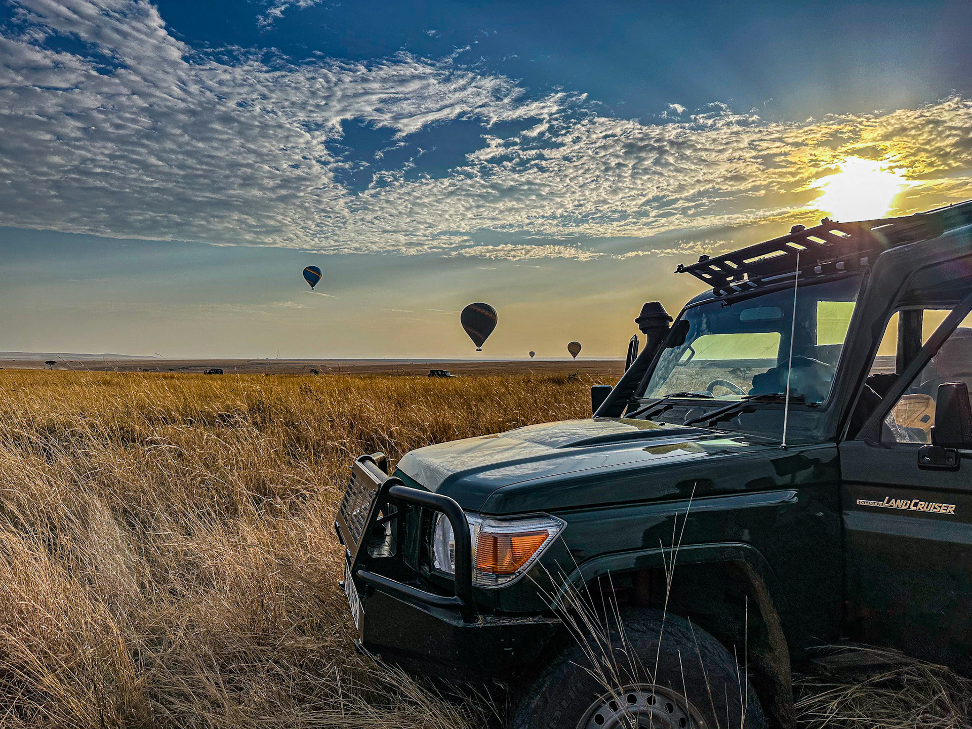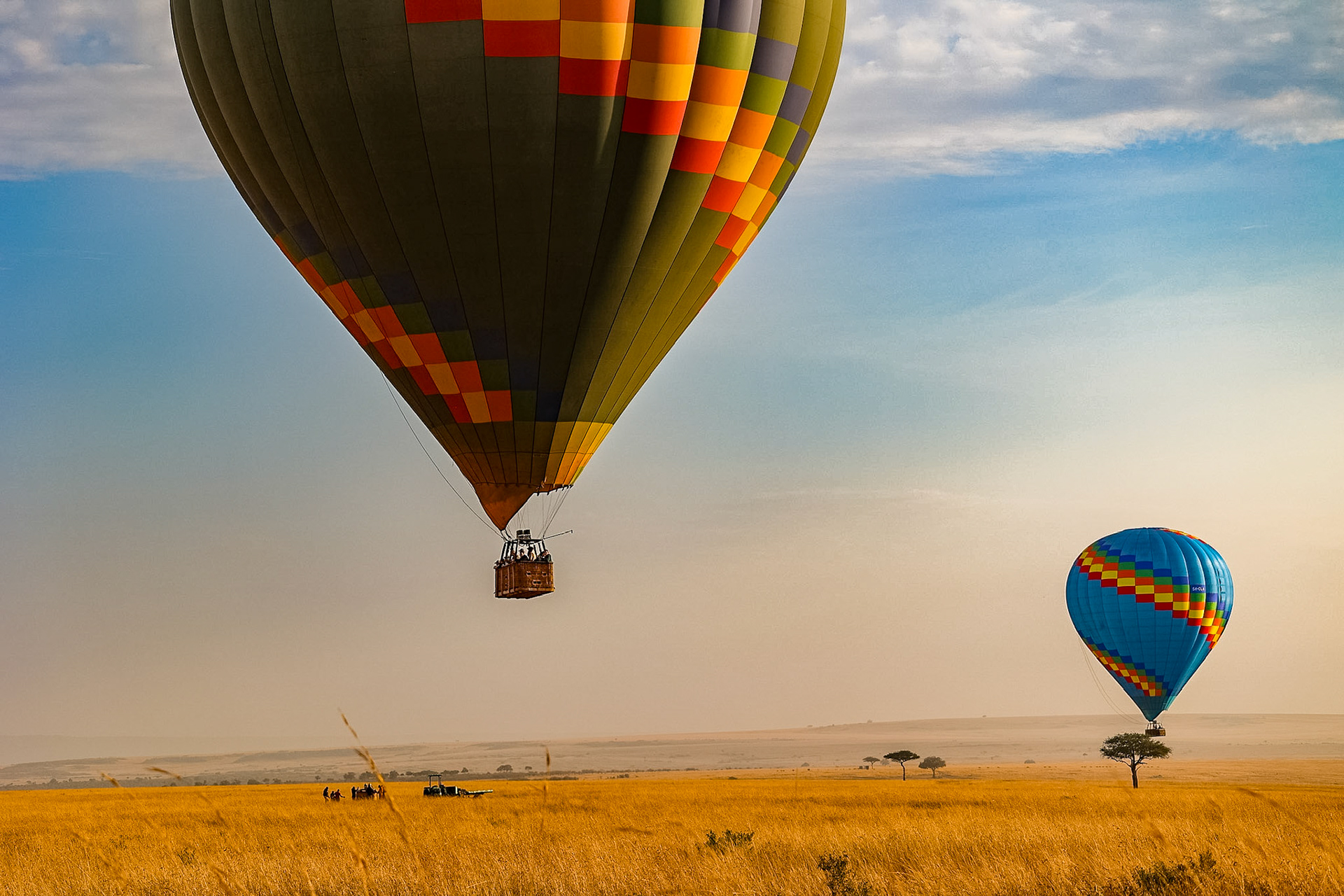 Under a crisp blue sky, vibrant hot air balloons gracefully descend upon the sunlit, golden savannah of the Maasai Mara. The hint of a safari jeep at the frame's edge adds to the adventure, as the wilderness awakens to a new day.