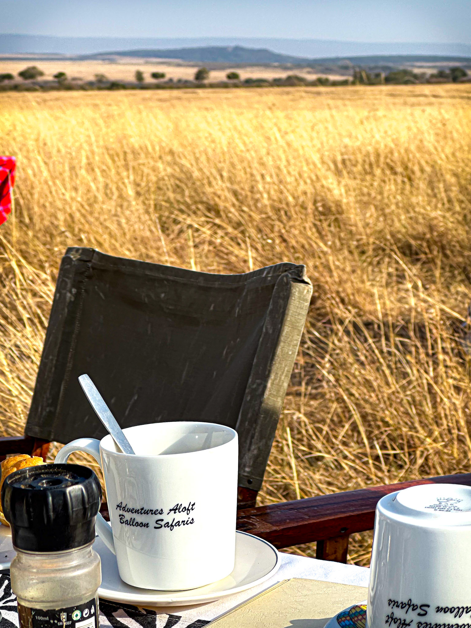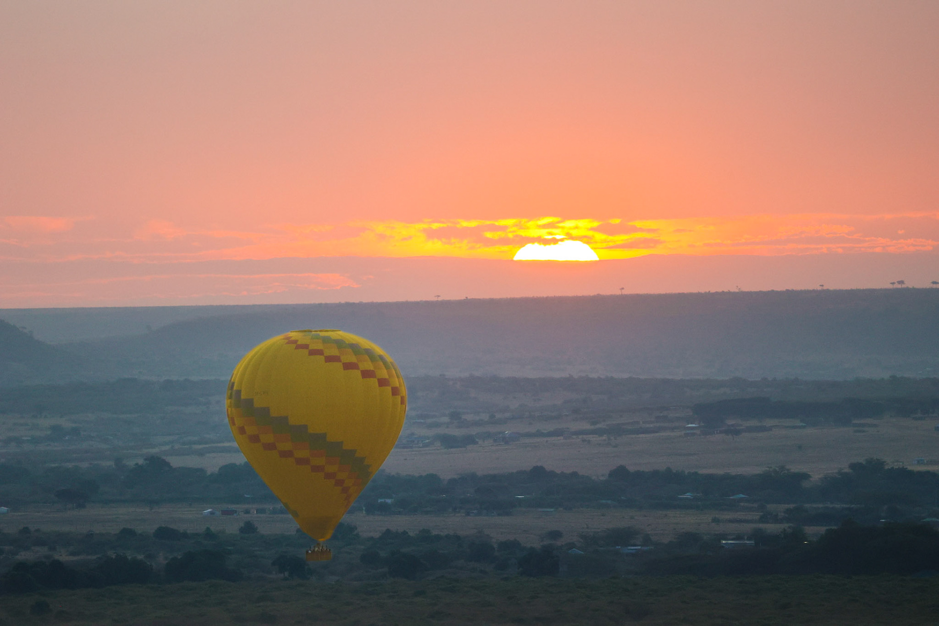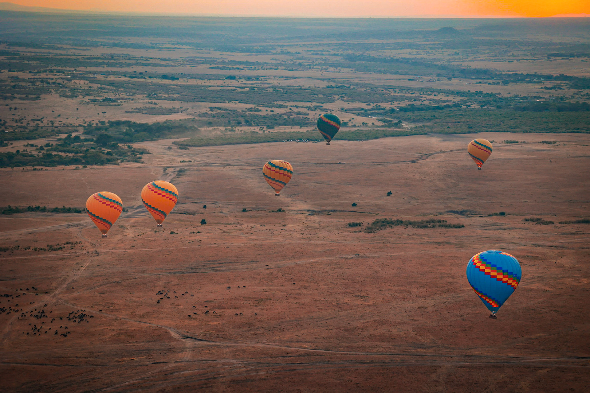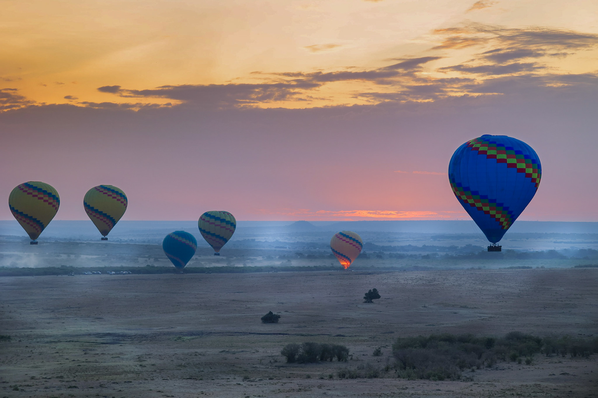 Under a crisp blue sky, vibrant hot air balloons gracefully descend upon the sunlit, golden savannah of the Maasai Mara. The hint of a safari jeep at the frame's edge adds to the adventure, as the wilderness awakens to a new day.