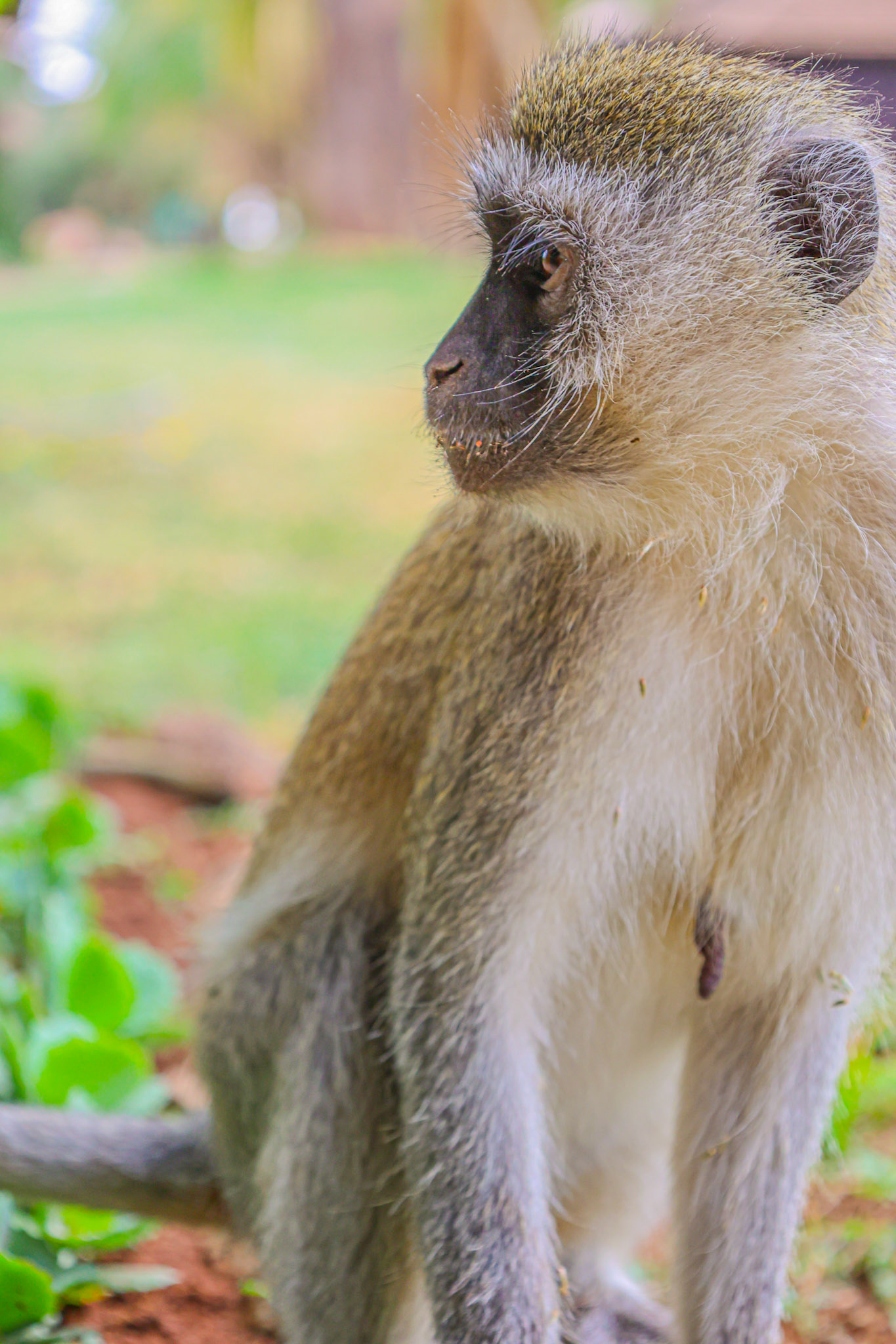 With a pear clutched in his grasp and a curious gaze to the side, this monkey appears to be contemplating his next delightful find.