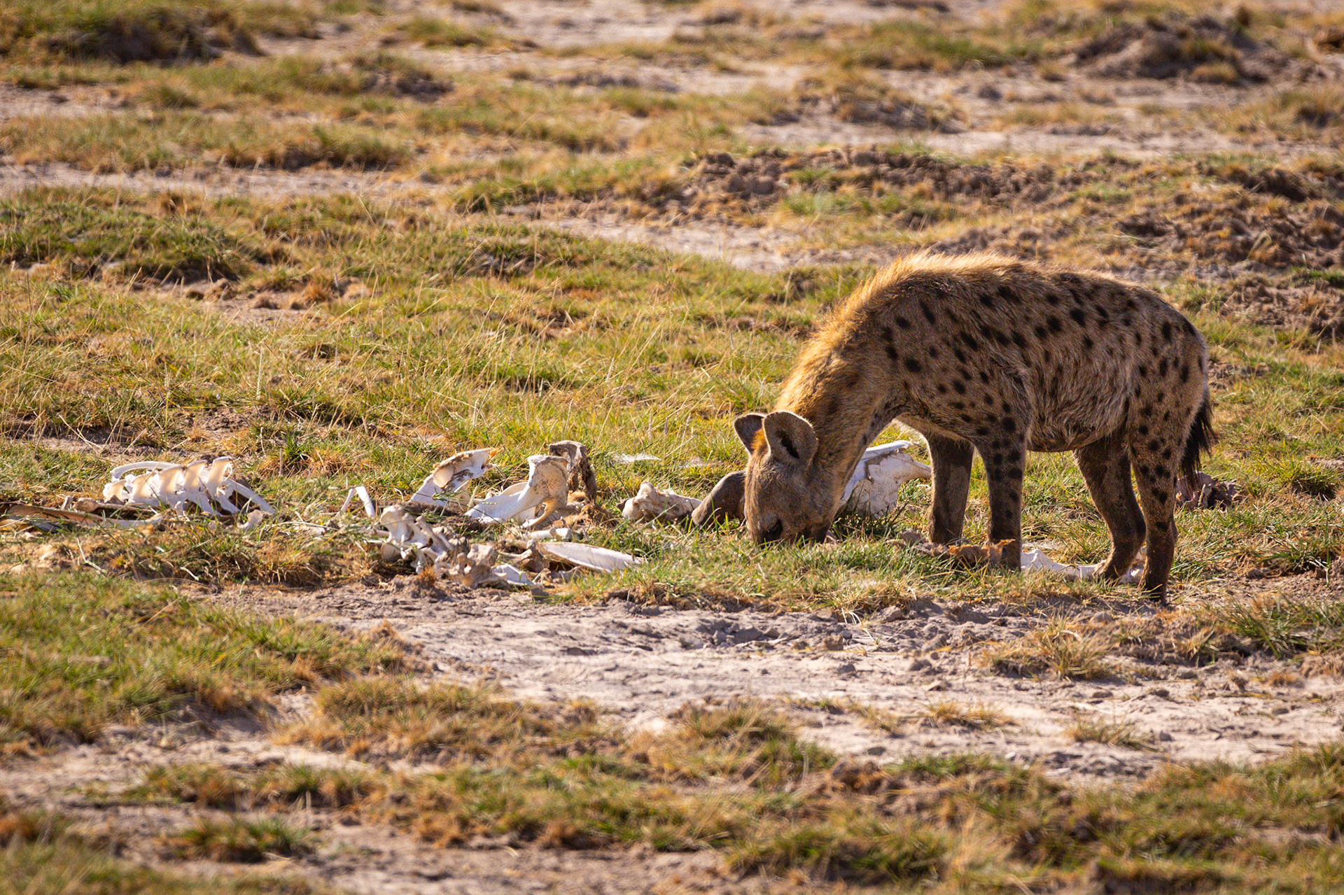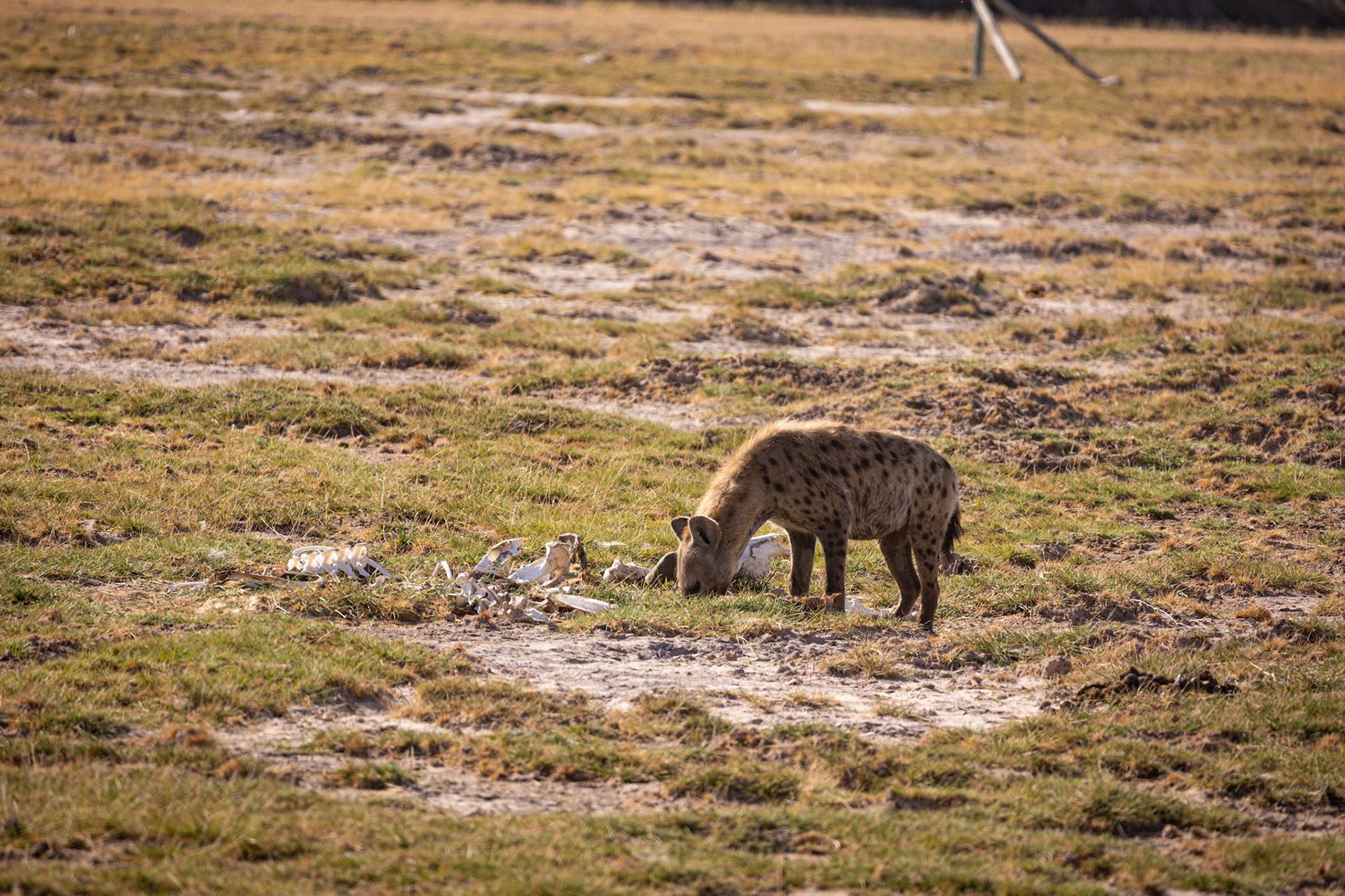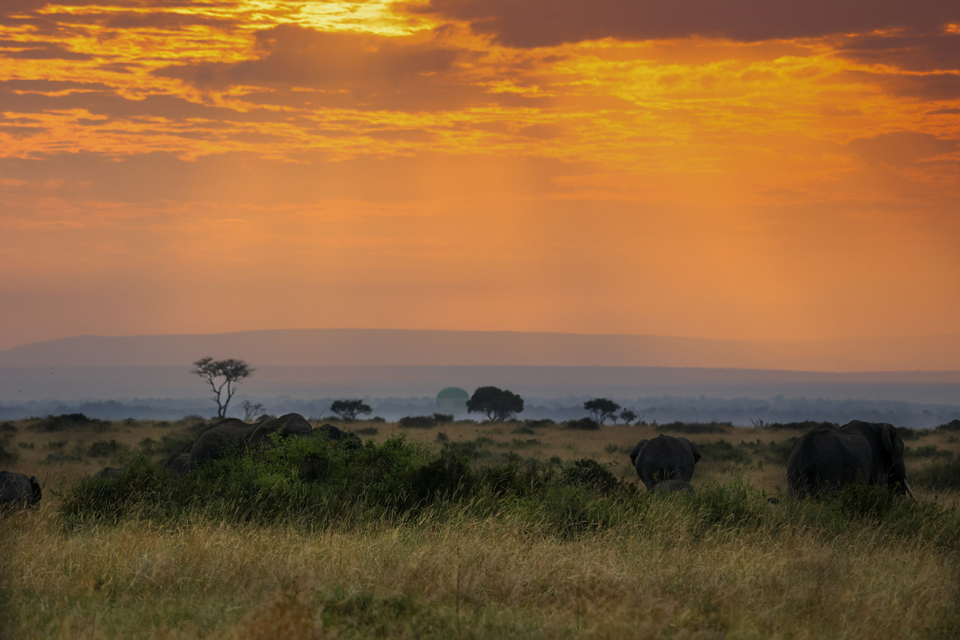 As the fiery red sun dips below the horizon, it casts a magical glow over the vast expanse of Amboseli's short green grasslands. The dramatic blue sky stretches out infinitely, creating a serene tableau of nature's timeless beauty.