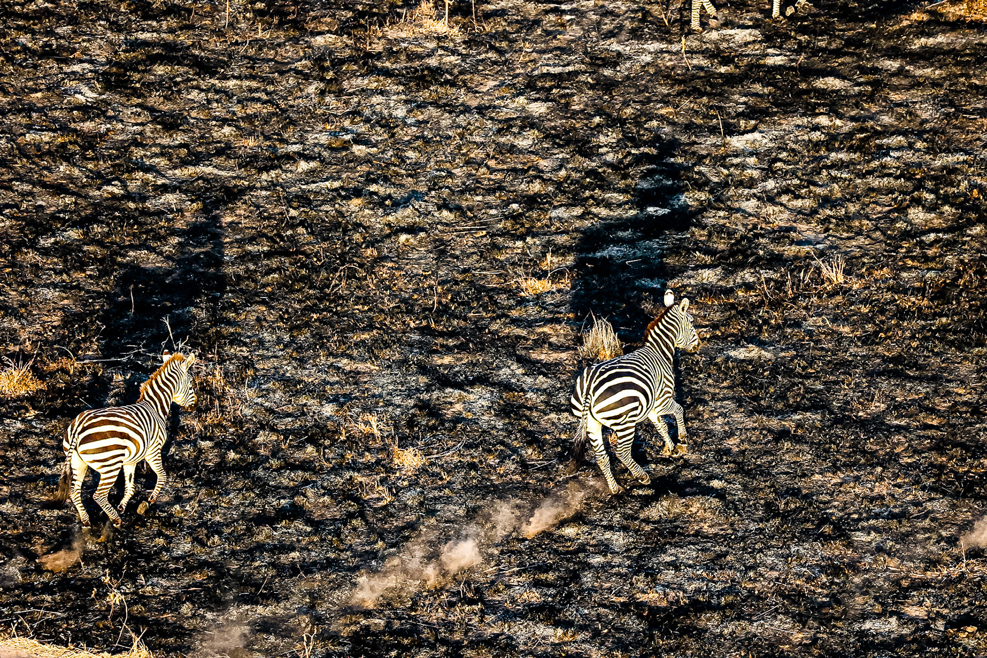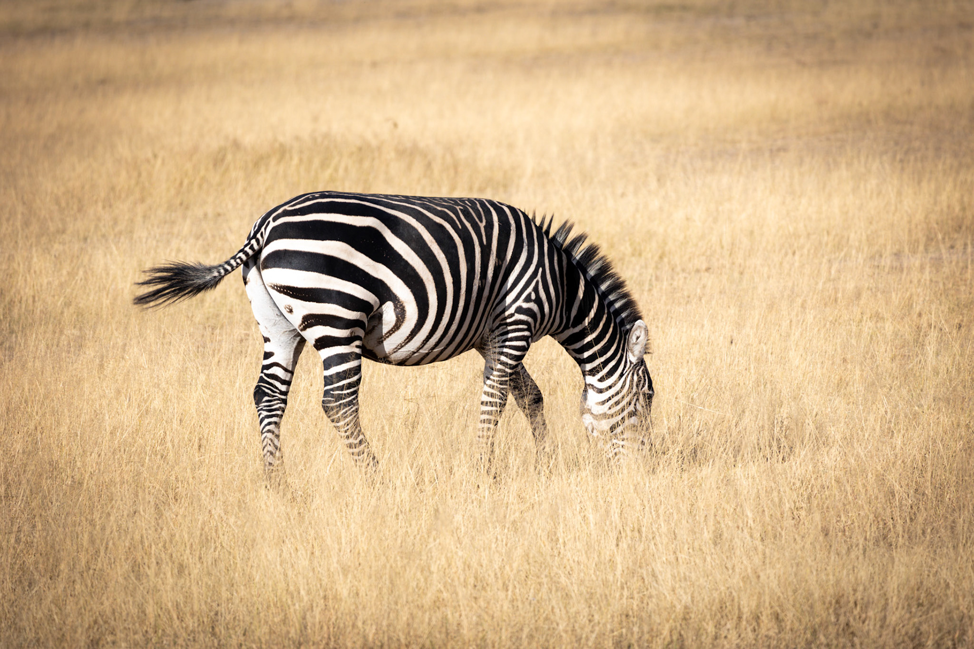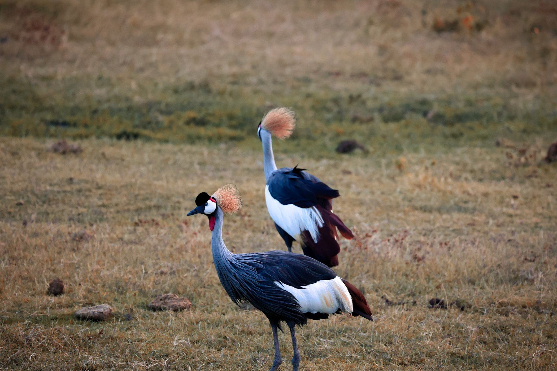 As the fiery red sun dips below the horizon, it casts a magical glow over the vast expanse of Amboseli's short green grasslands. The dramatic blue sky stretches out infinitely, creating a serene tableau of nature's timeless beauty.