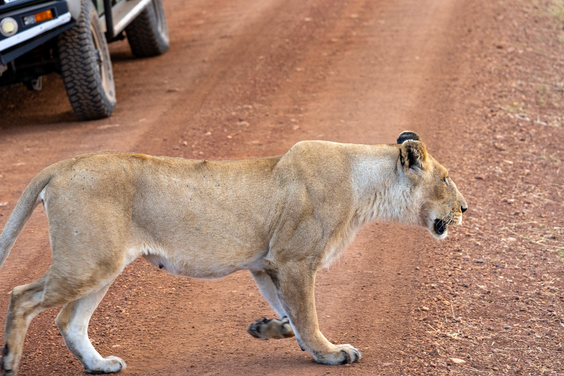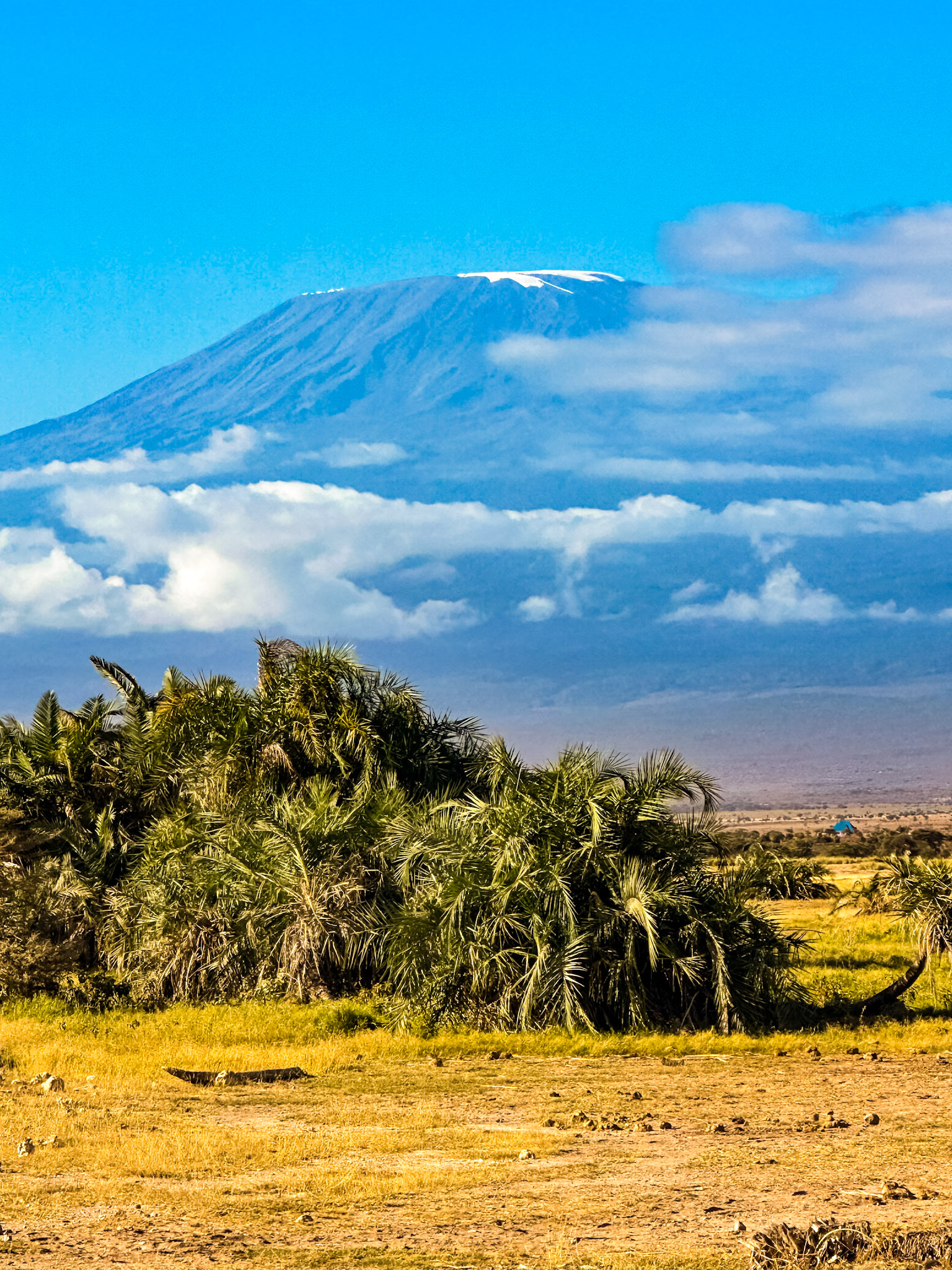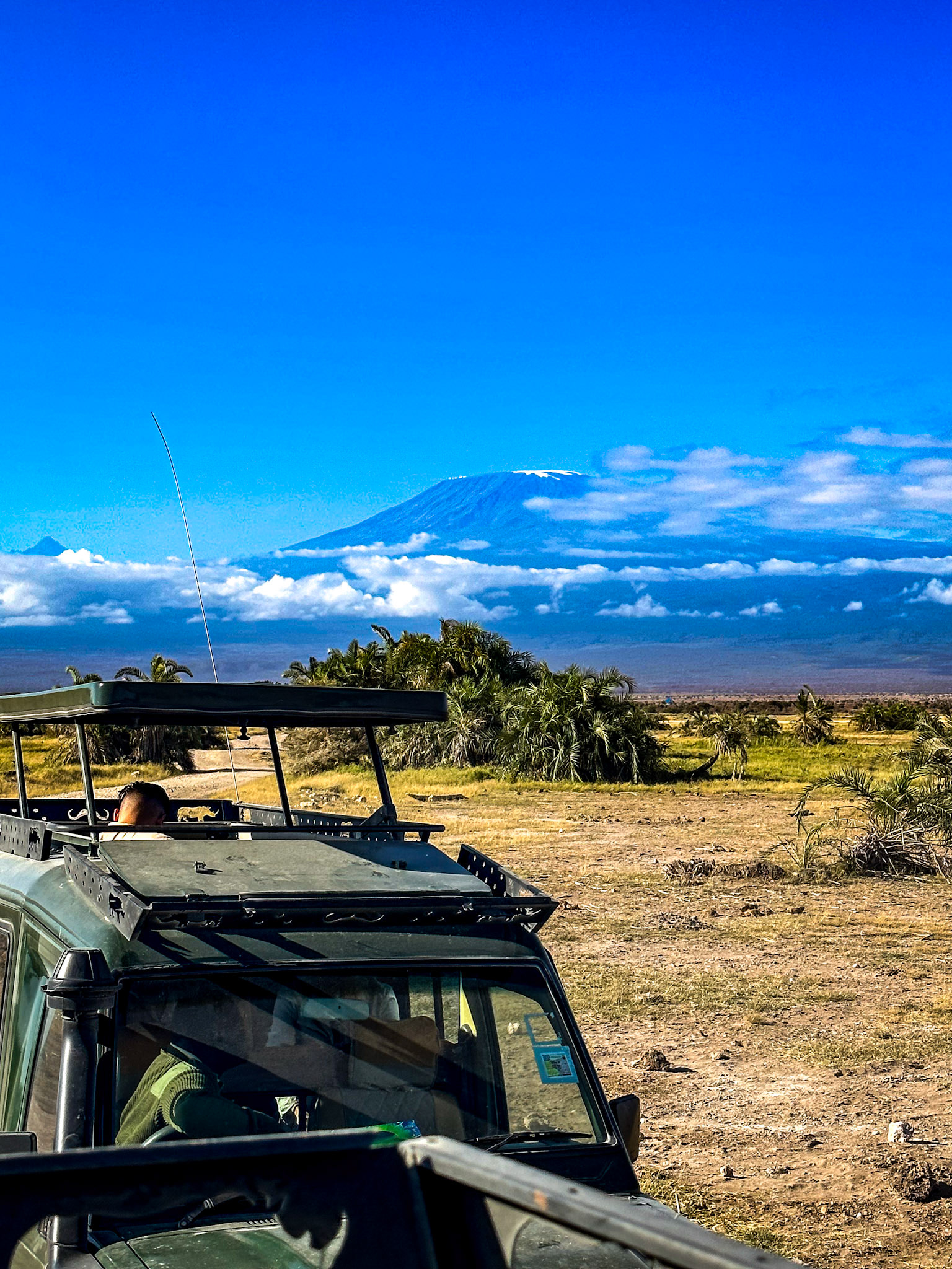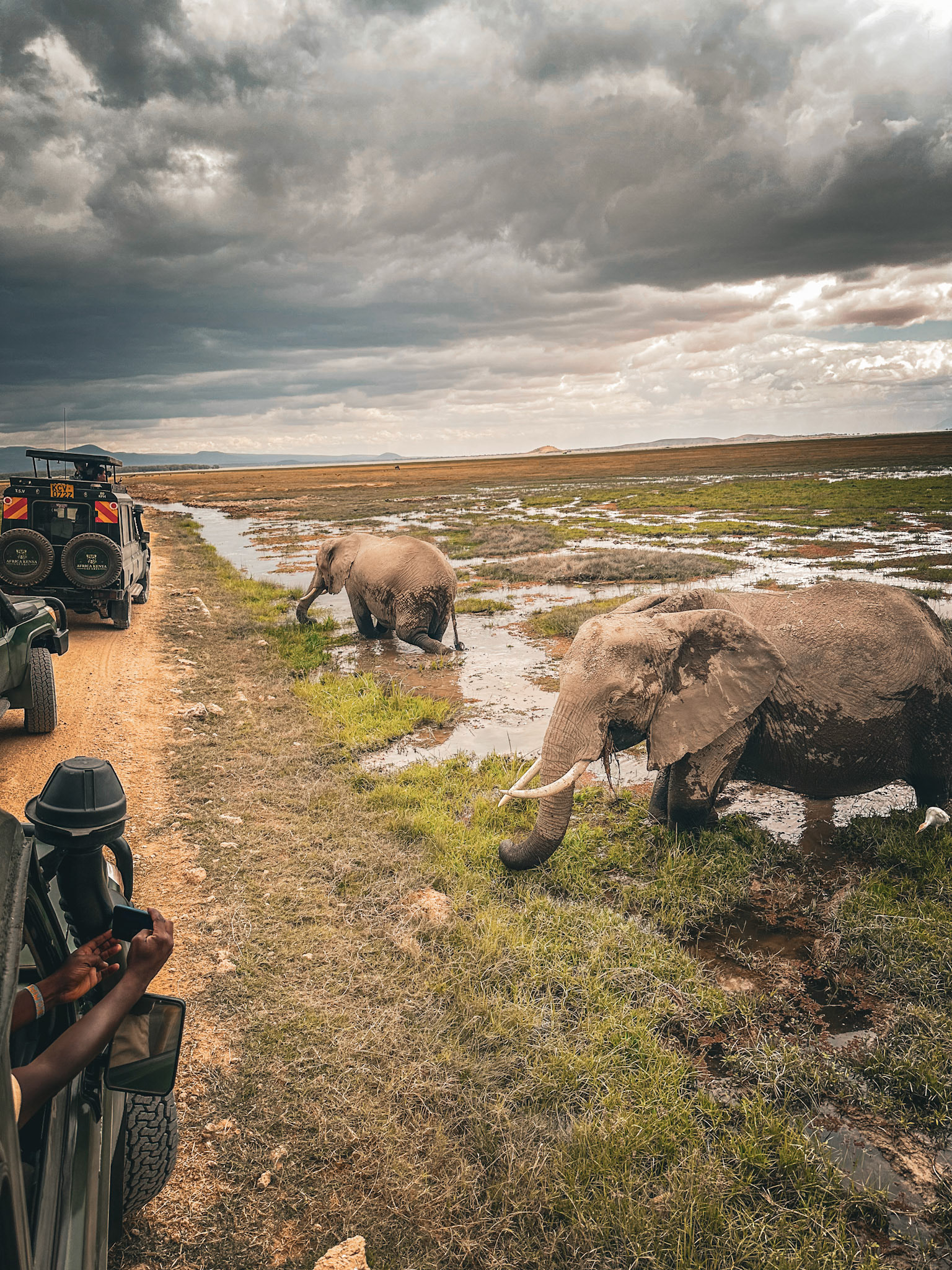 An awe-inspiring elephant parade in Amboseli: Majestic adults and playful calves, crossing the savannah and the road, commanding respect with every step.