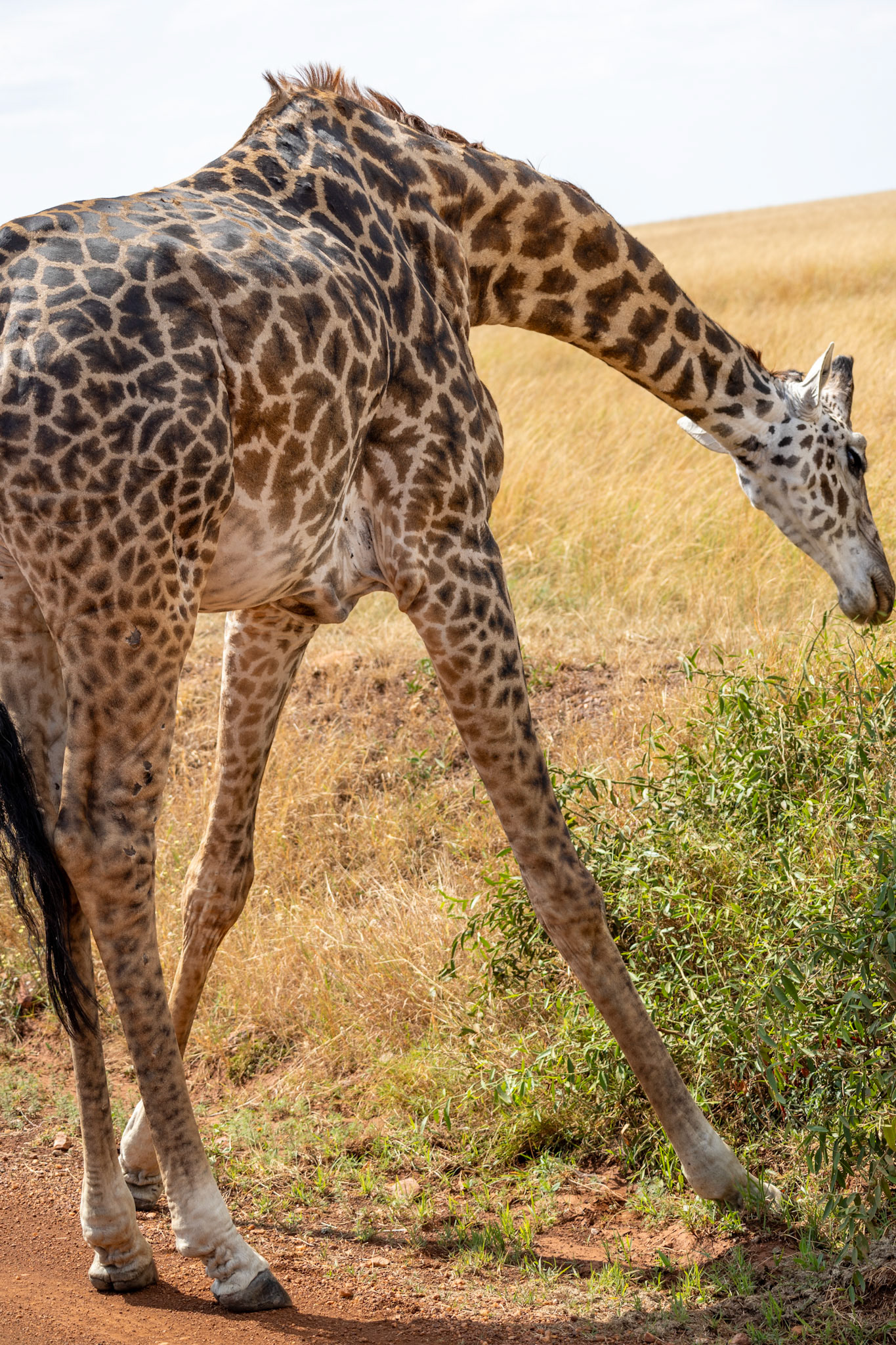 A giraffe gracefully snacks on a bush, the simplicity of her meal captured in this intimate portrait.