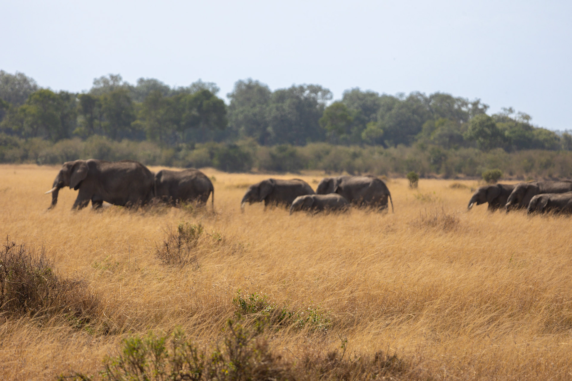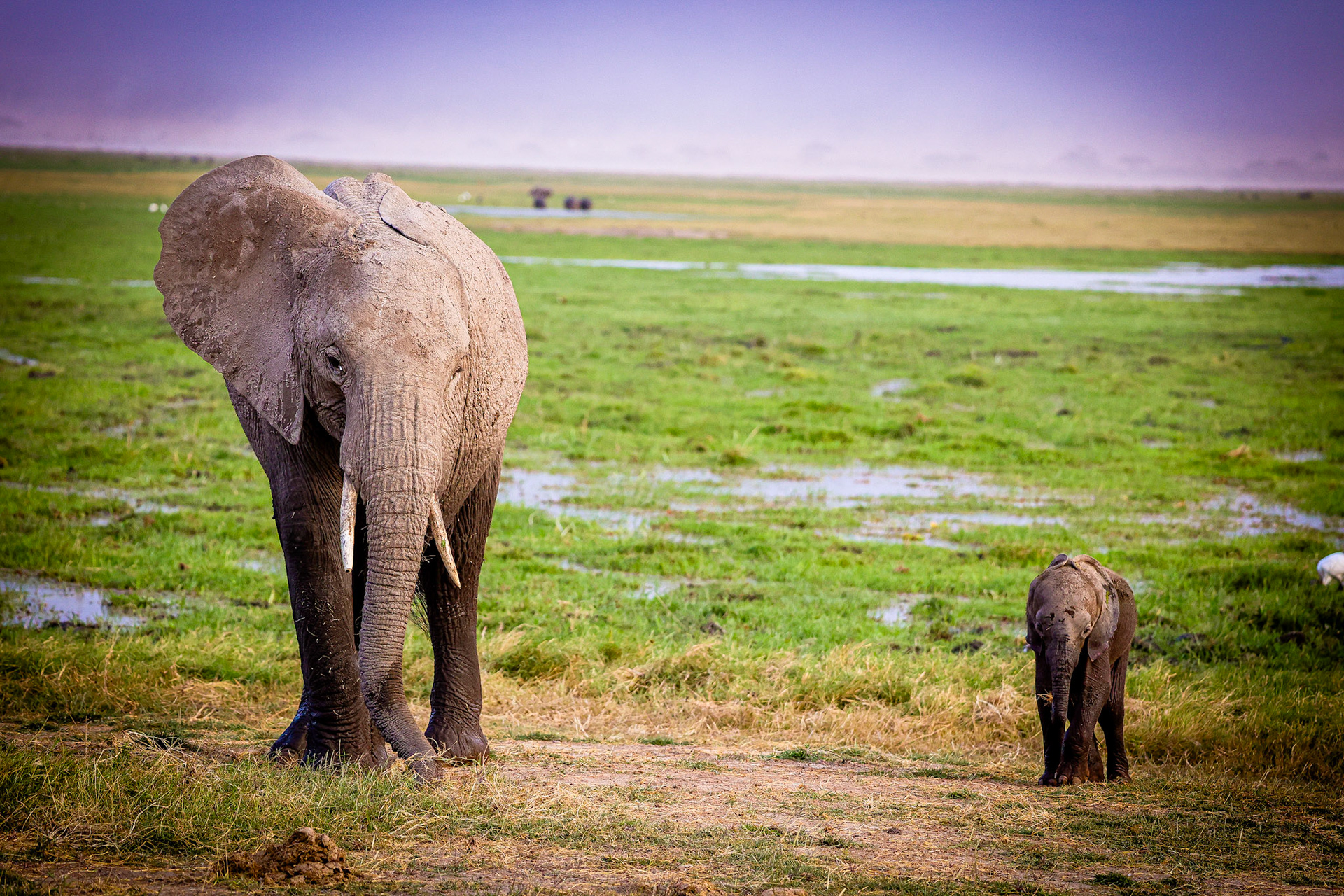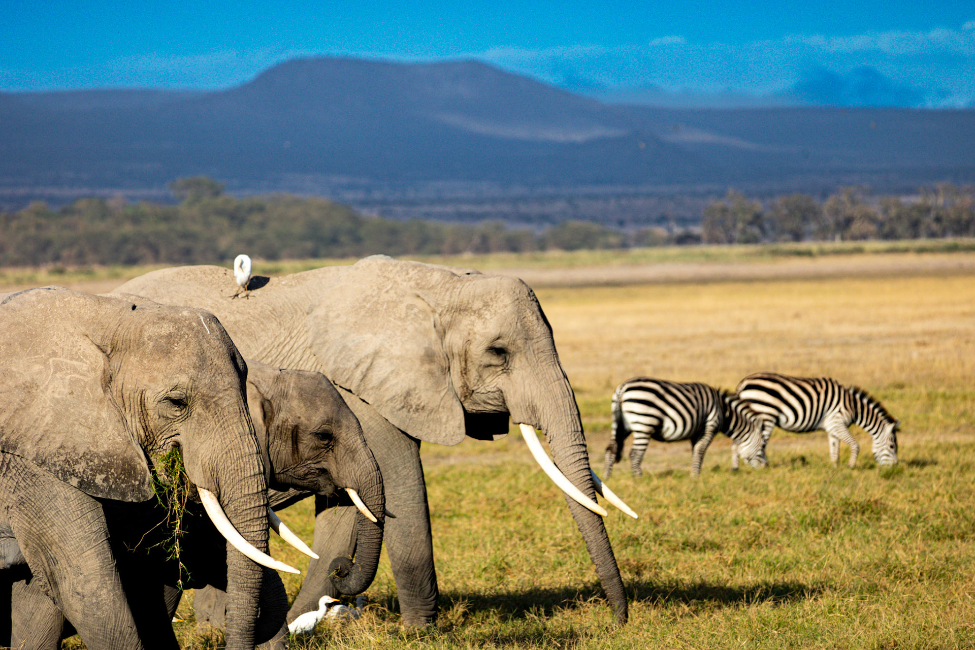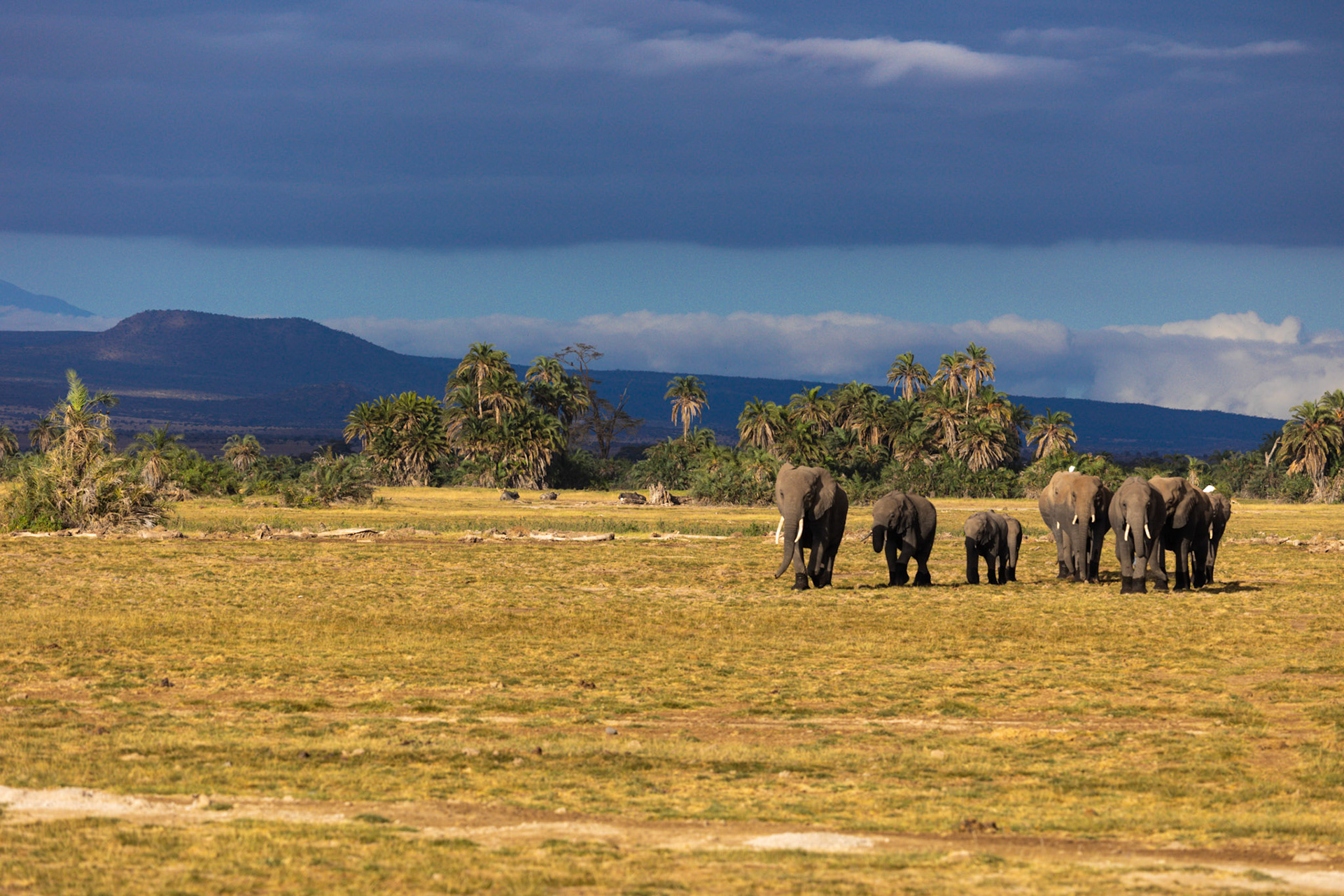 In the lush grasslands of Amboseli Park, a family of elephants march with purpose