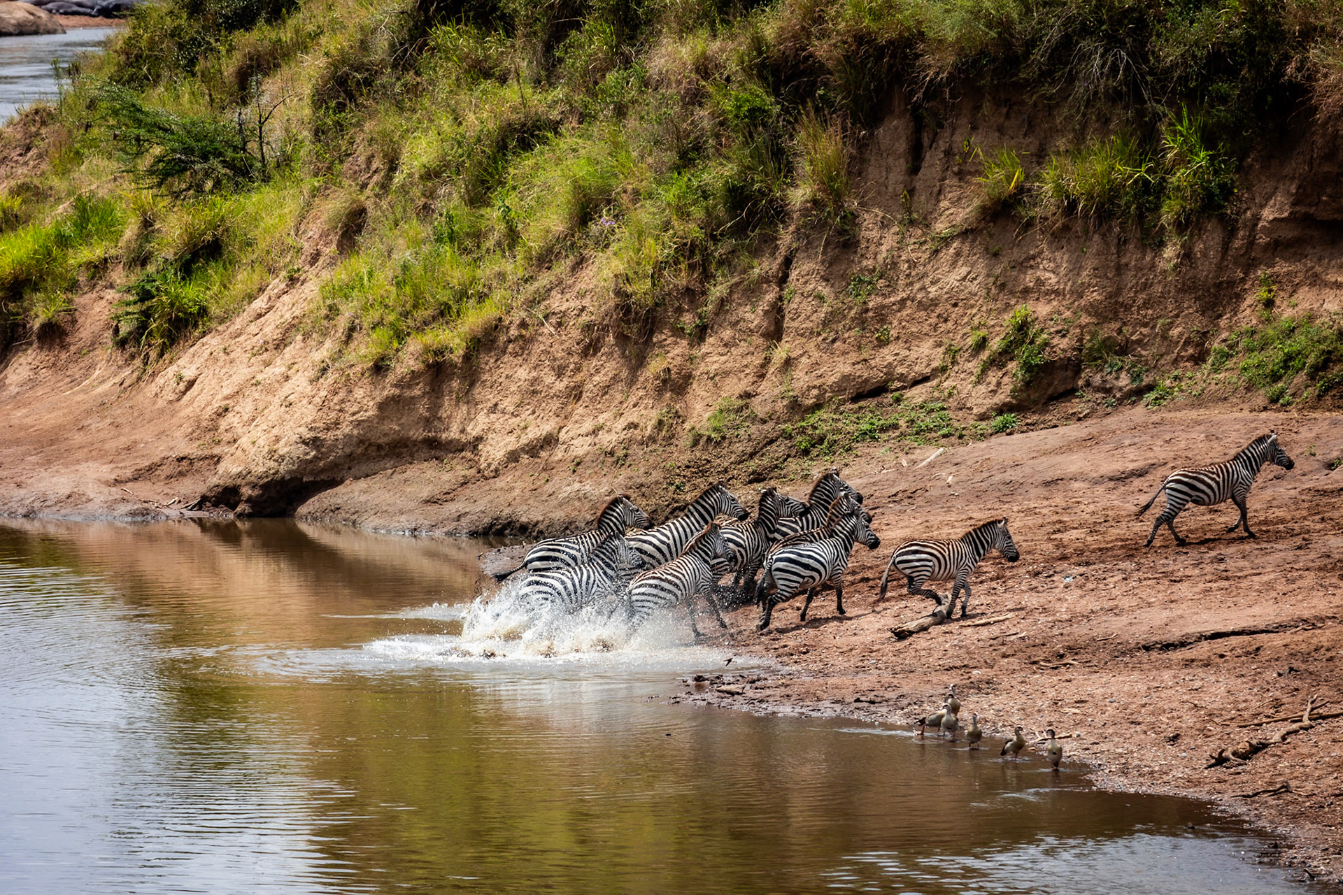 In the lush grasslands of Amboseli Park, a family of elephants – three poised adults leading three playful young – march with purpose. Their grand procession is humorously halted by a solitary duck, unconcerned and unperturbed, adding a touch of whimsy to the majestic landscape.